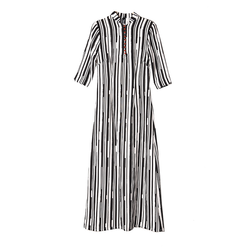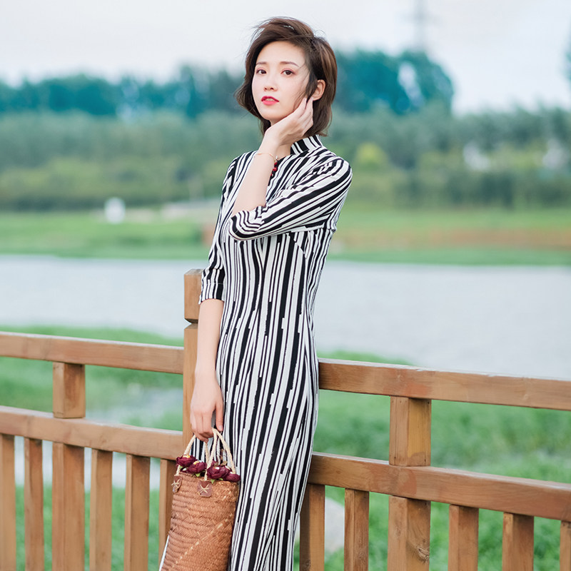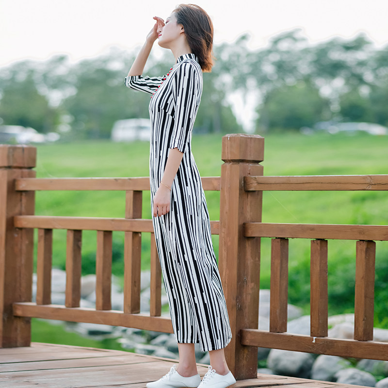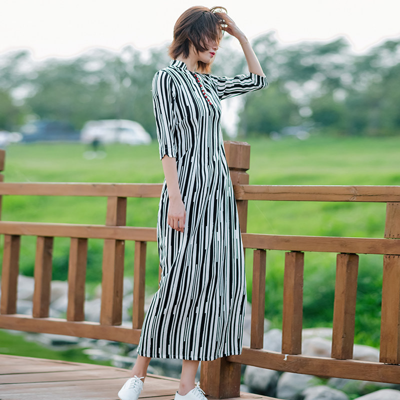 改良旗袍裙长裙 七分袖 2020春秋新款 复古文艺民族风亚麻连衣裙女装