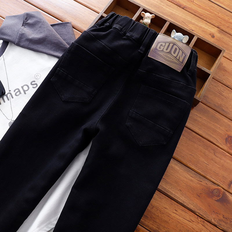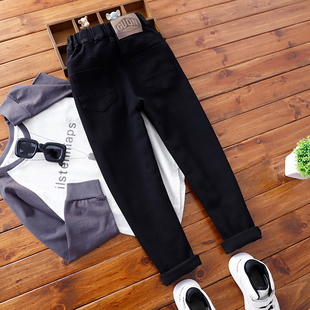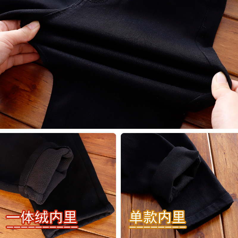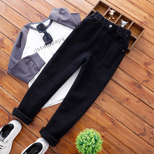中大童一体绒裤 男童黑色瘦版 儿童秋冬休闲加绒小脚裤 牛仔裤 子 修身