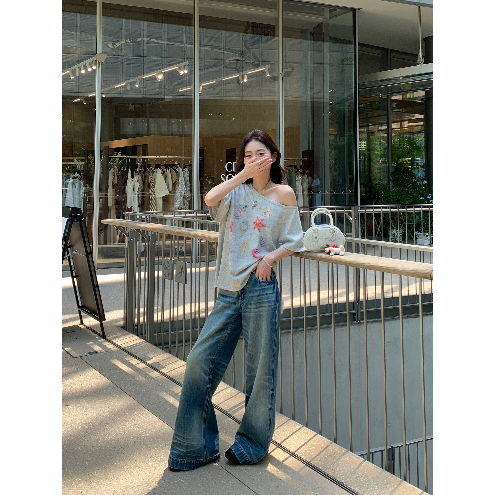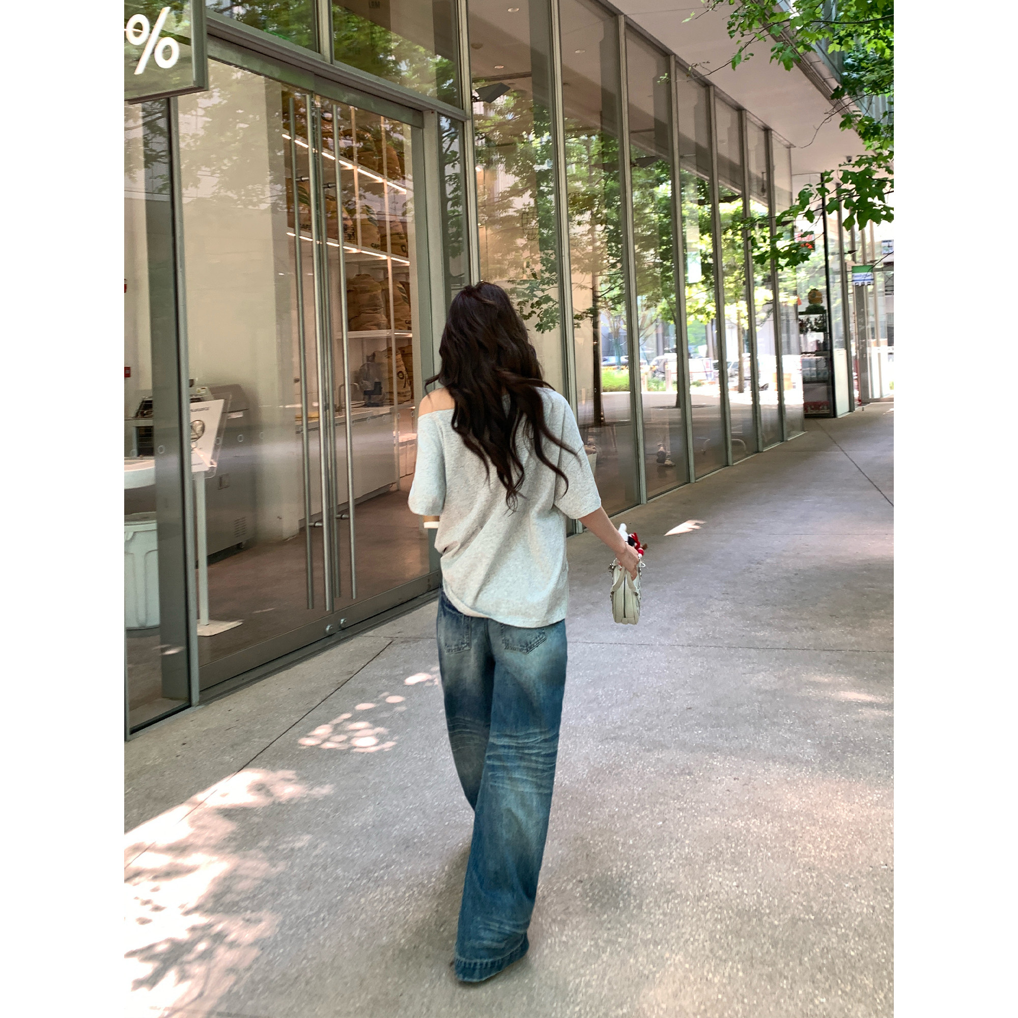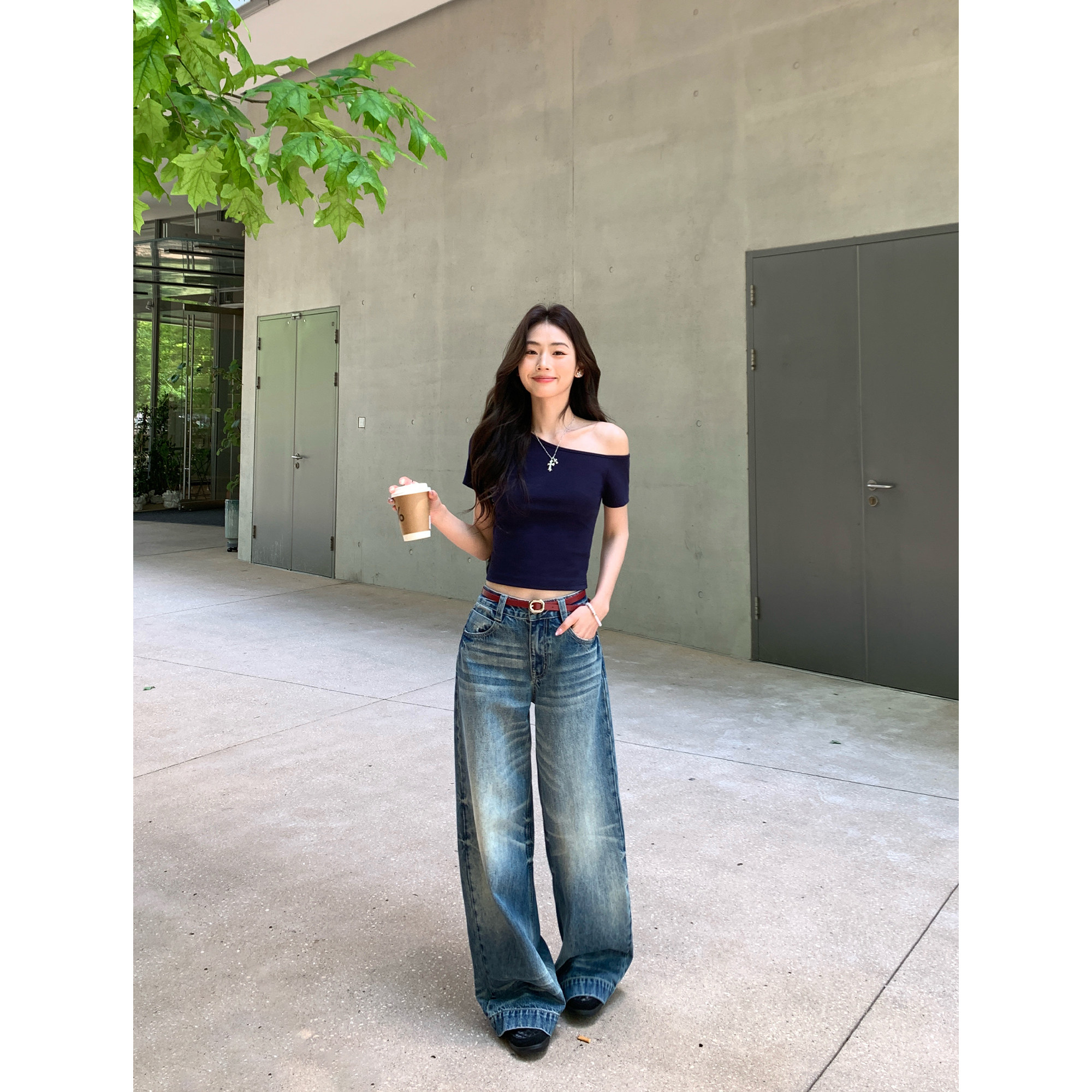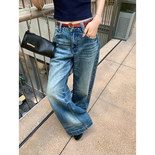 宽松直筒长裤 pusumede竹节纹重工洗水牛仔裤 女复古做旧小众阔腿裤
