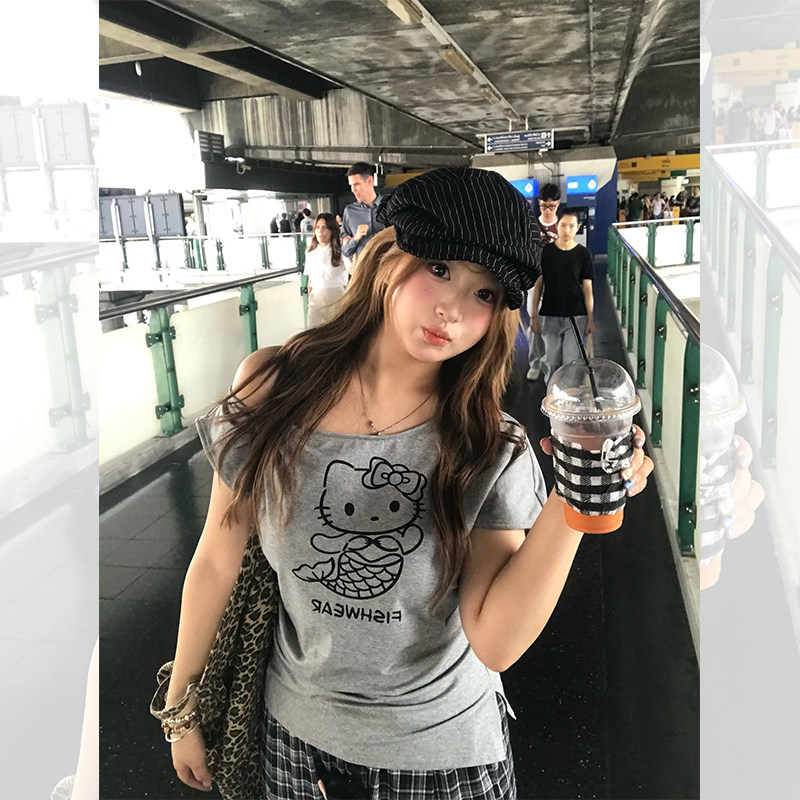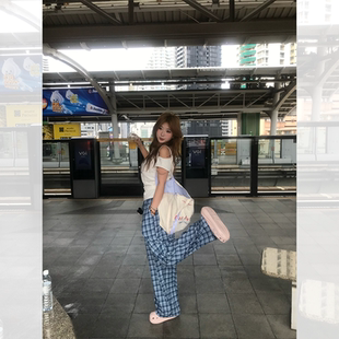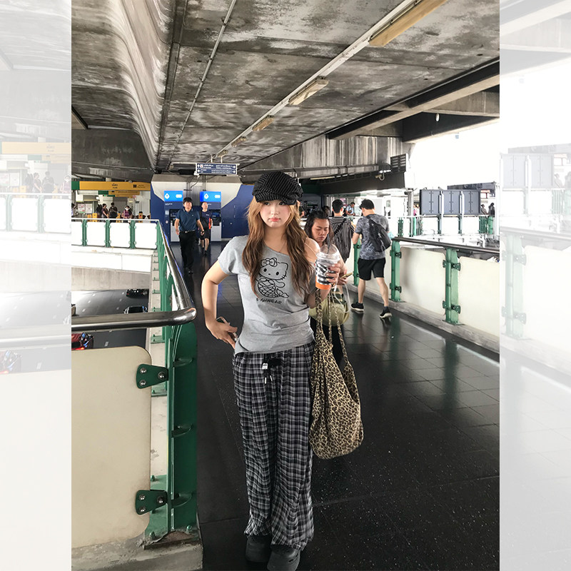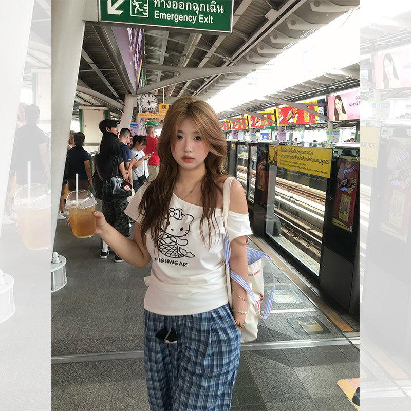 鱼 上衣格纹休闲裤 人鱼Kitty 微胖mm斜肩宽松短袖 韩女神裤 你