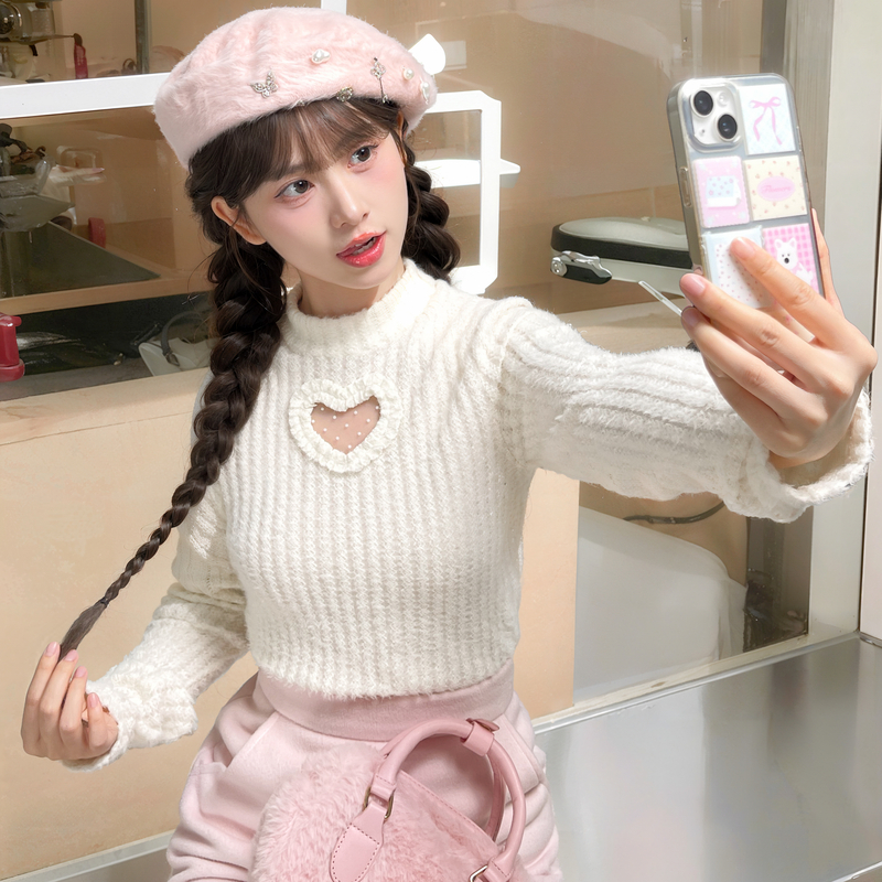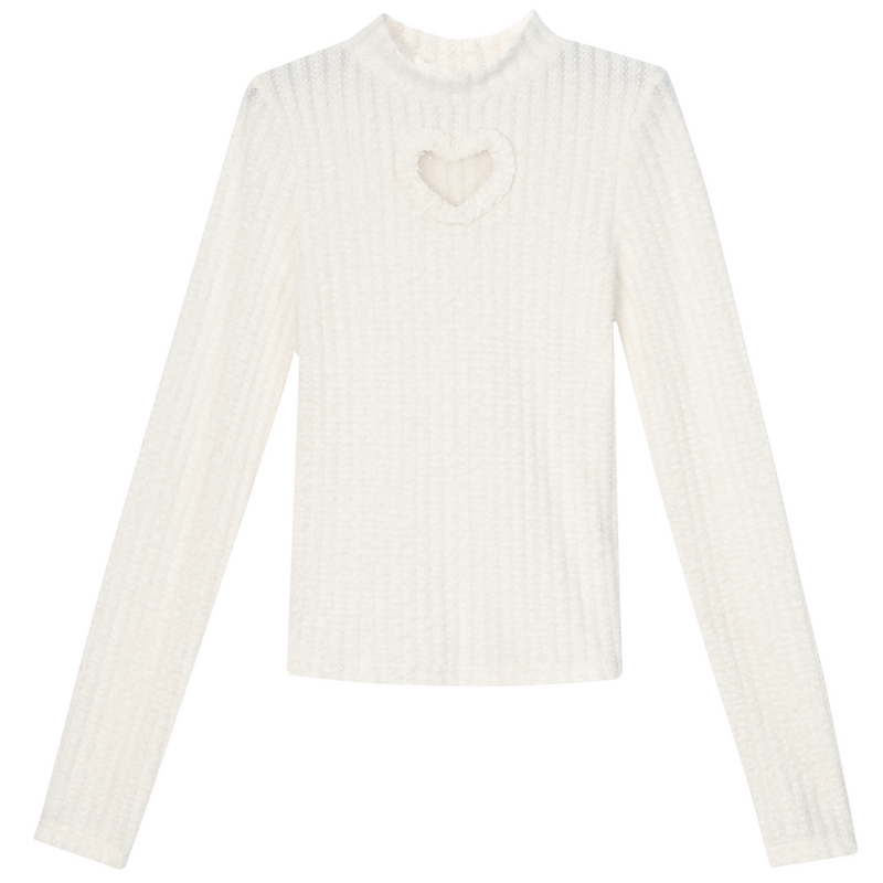 上衣秋2025冬新款 内搭长袖 女加绒修身 森女部落爱心镂空白色打底衫