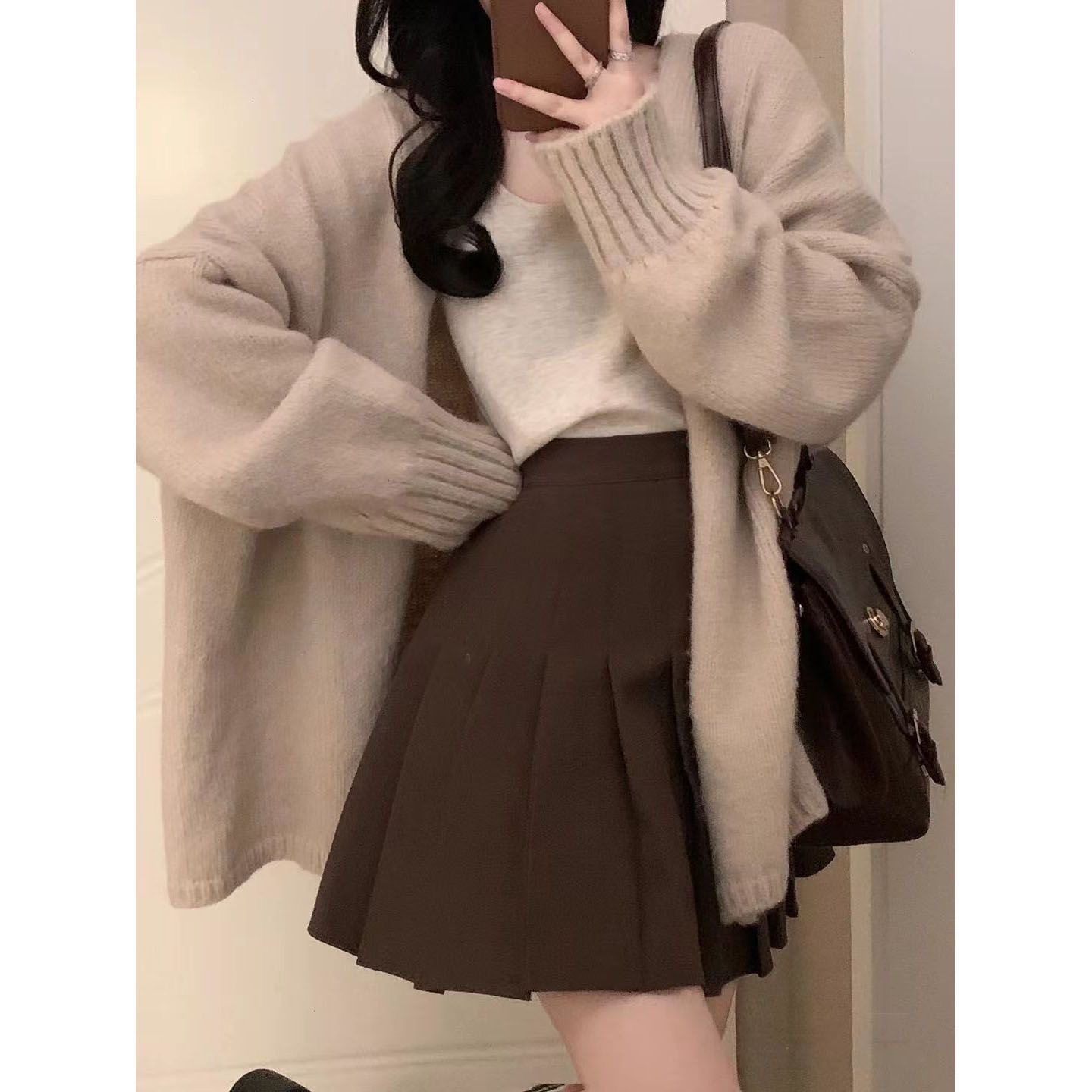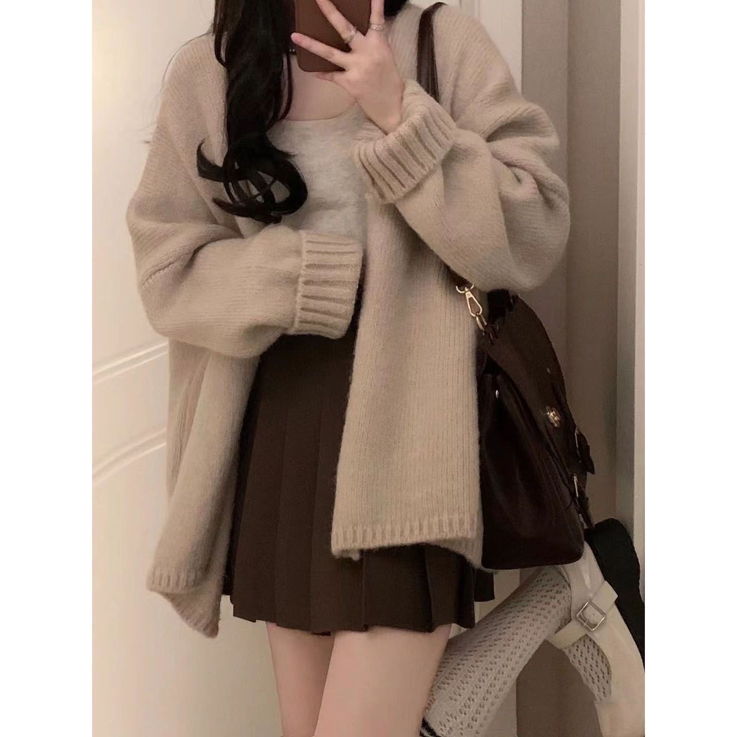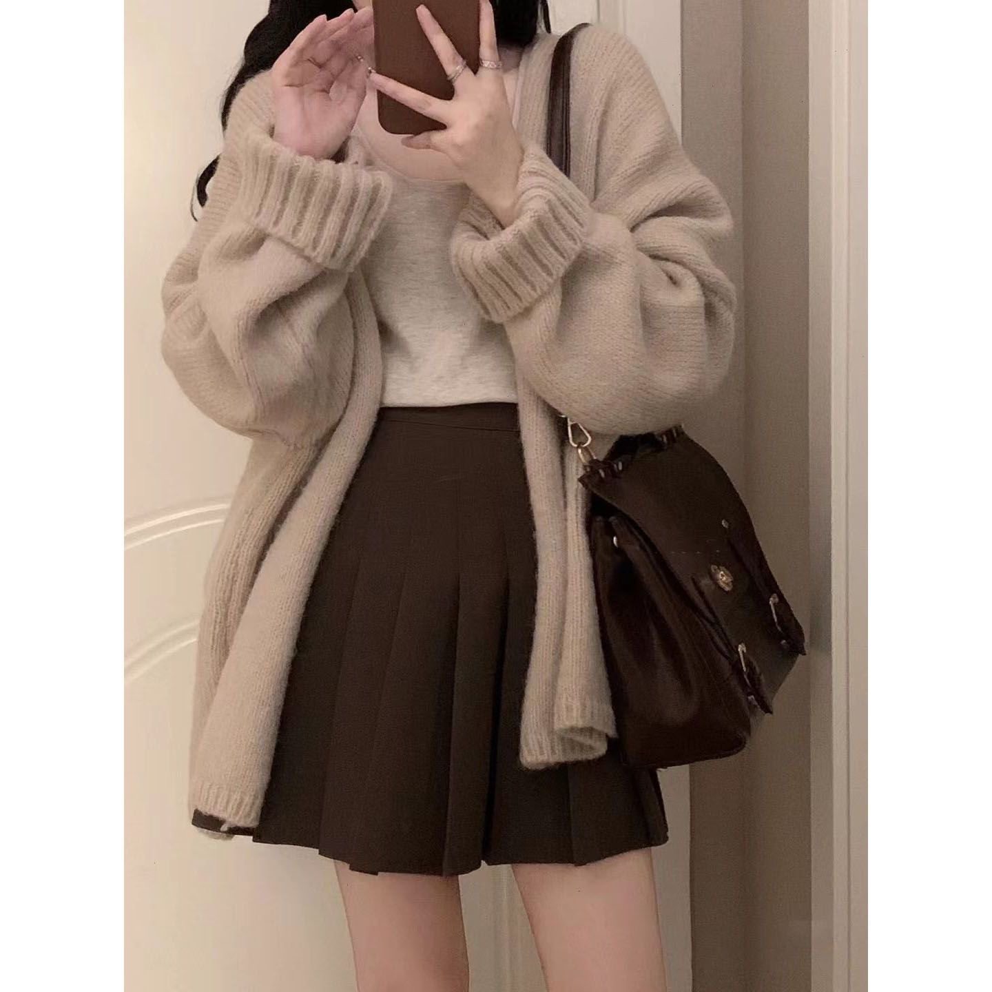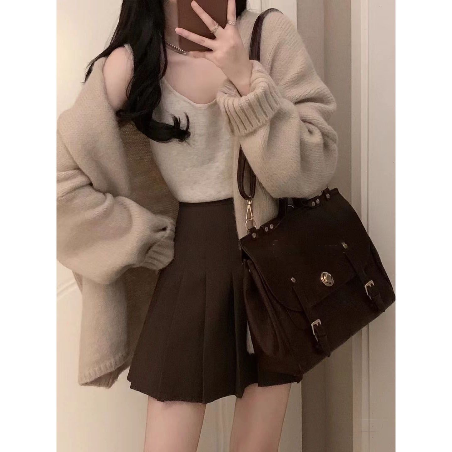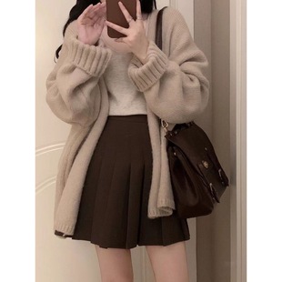开衫 温柔学院风穿搭韩版 毛衣吊带背心学生百褶裙 女秋冬季 三件套装
