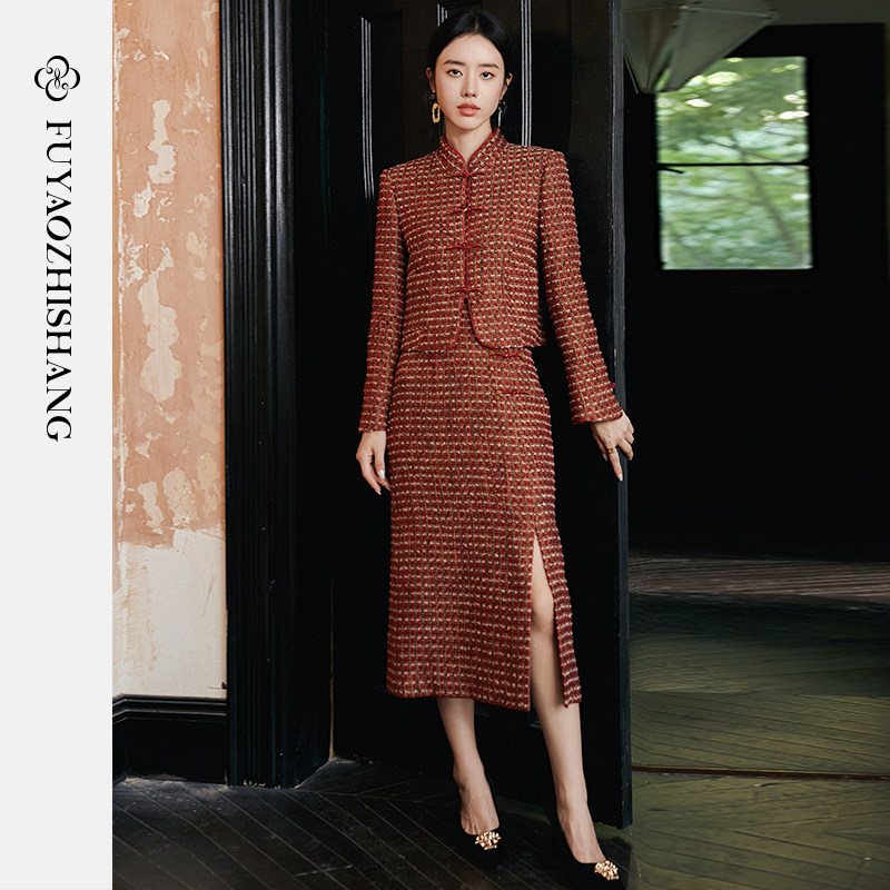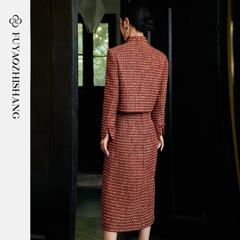 FUYAO扶摇 轻奢重工外套开叉半身裙红色小香风粗花呢编织羊毛套装
