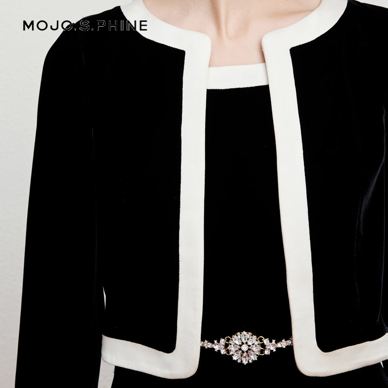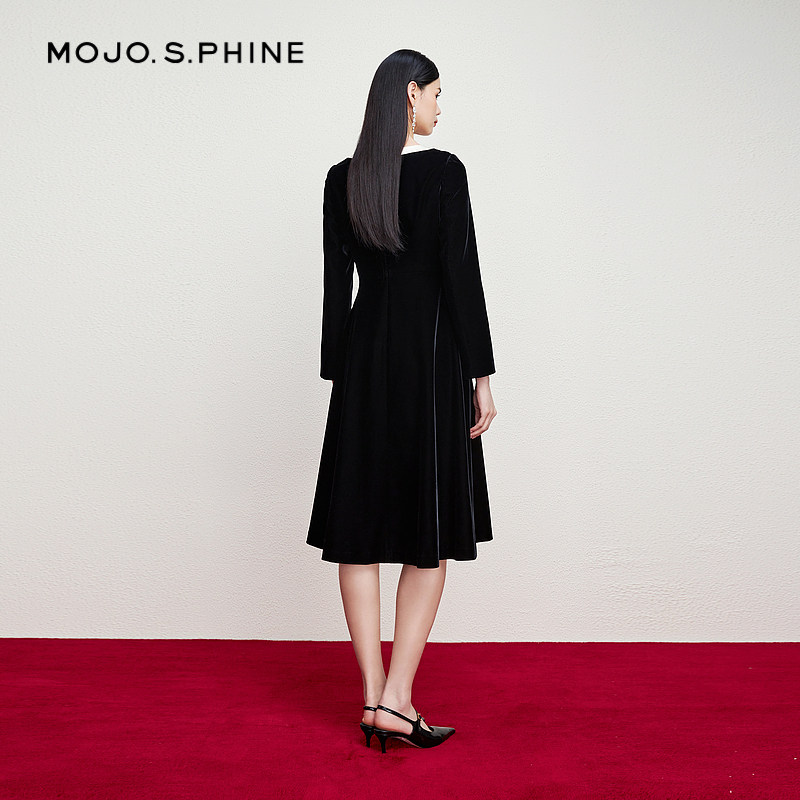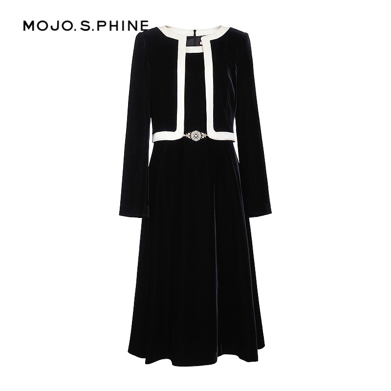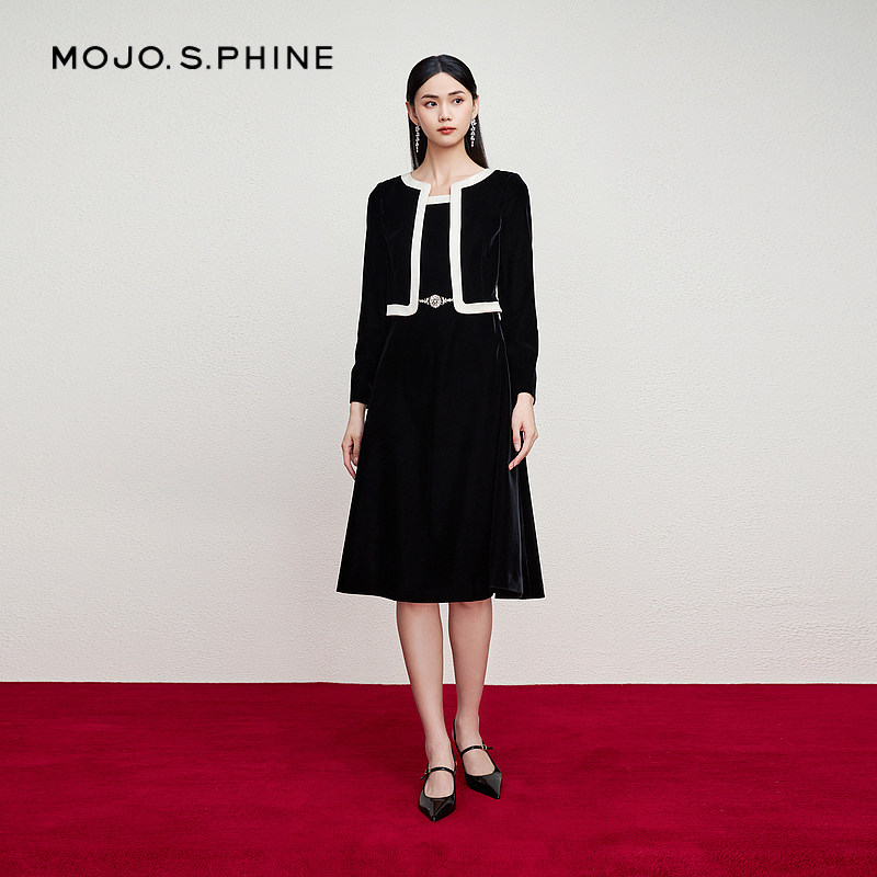 MOJO莫佐法式 假两件优雅撞色层次感长裙 香风丝绒连衣裙2024年新款