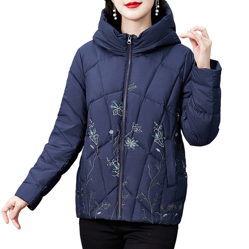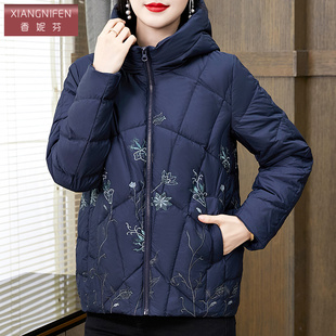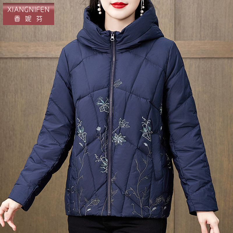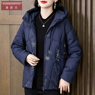 新款 香妮芬蓝色气质绣花小个子立领连帽白鹅绒羽绒服短款 2025冬季
