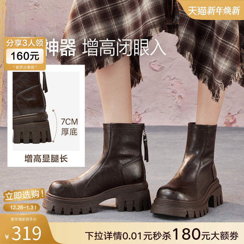 短靴皮靴冬新款 天美意复古英伦厚底加绒马丁靴女鞋 子休闲时装