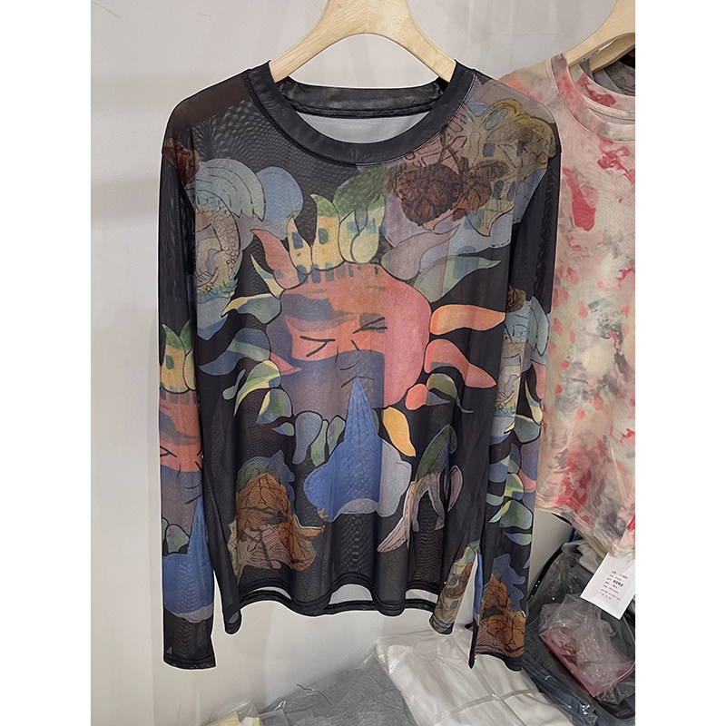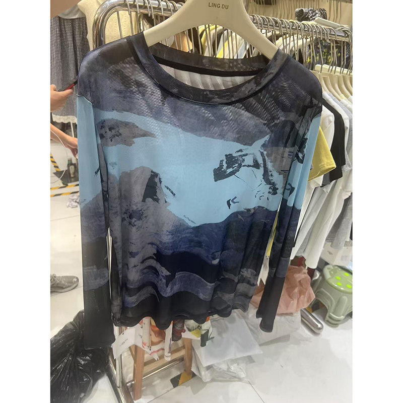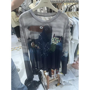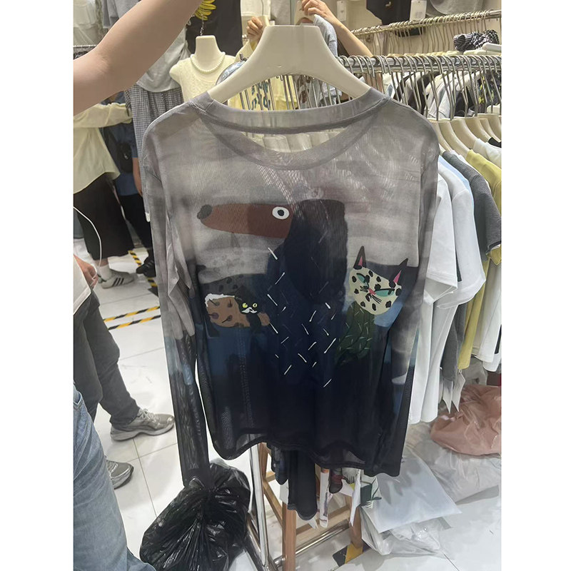 洋气减龄打底防晒衫 薄新款 上衣 T恤女春夏季 扎染卡通猫咪网纱长袖