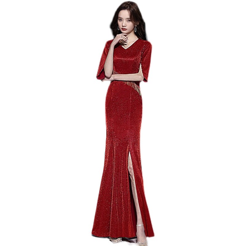礼服主持宴会车模晚装 新款 显瘦性感开叉长款 双肩修身 晚礼服