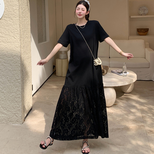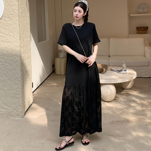 梨型身材宽松休闲黑色连衣裙女夏季 蕾丝裙摆拼接设计感直筒T恤裙
