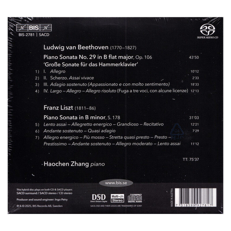 钢琴演奏贝多芬和李斯特奏鸣曲 张昊辰 SACD唱片BIS2781 进口 原装