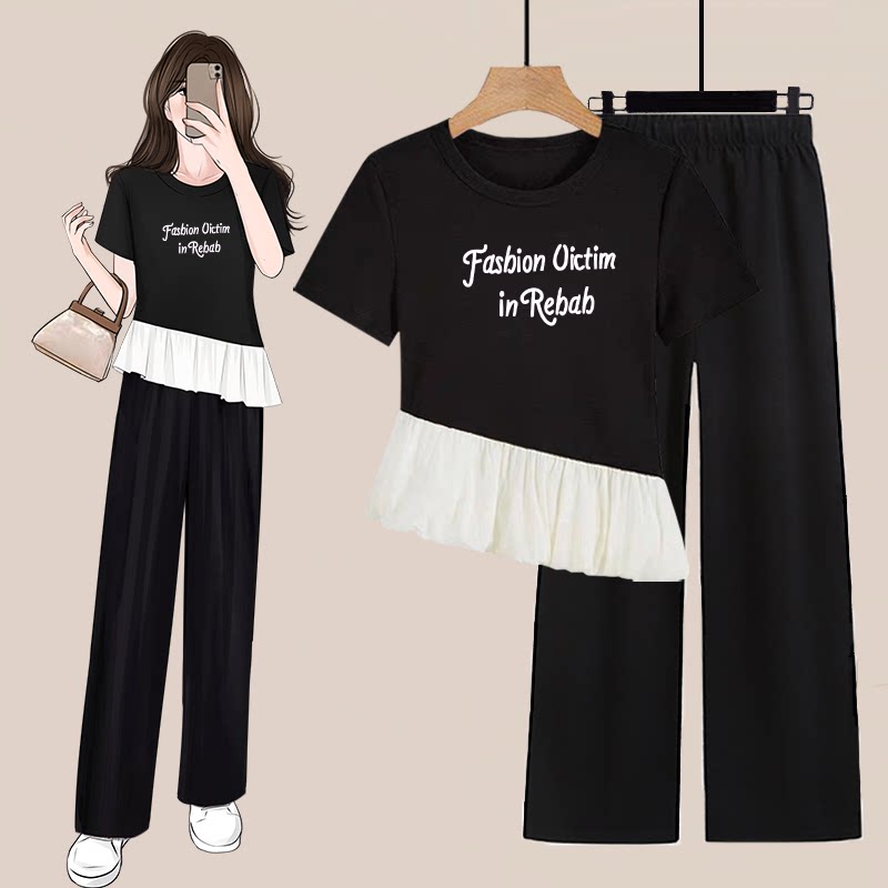 高腰阔腿裤 夏季 T恤 穿搭一整套女不规则荷叶边设计短袖 两件套 时尚
