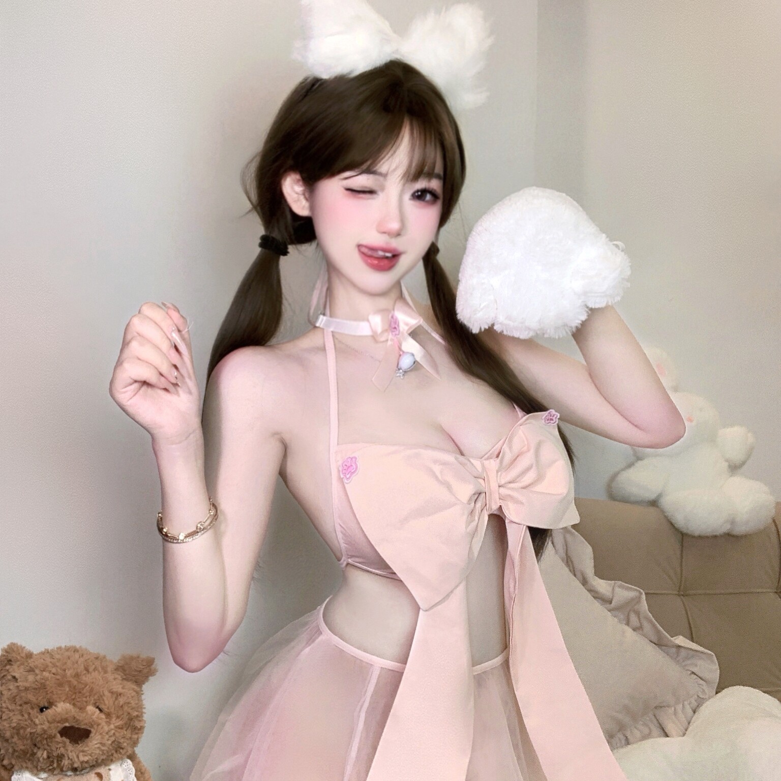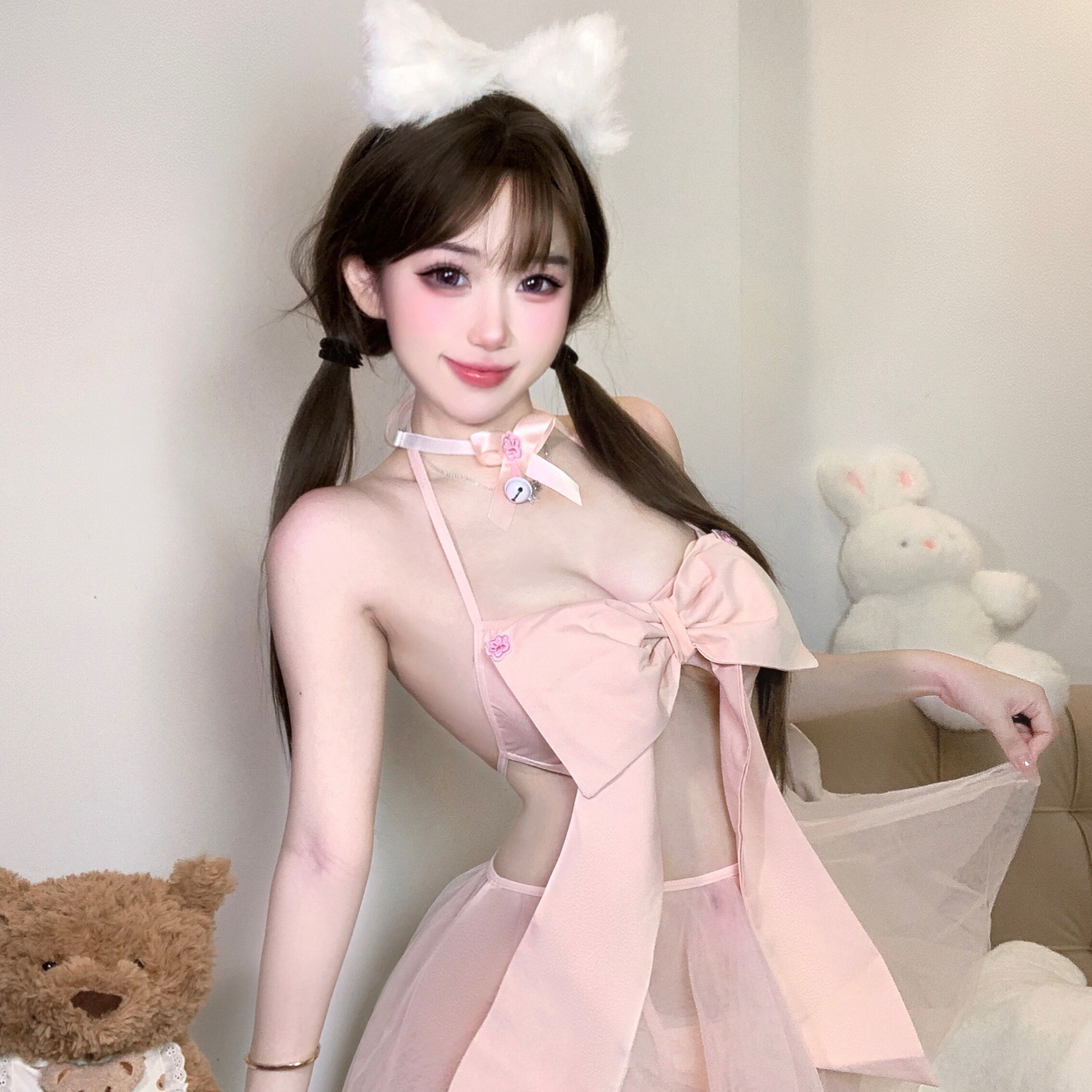 性感纯欲可爱镂空粉色蝴蝶结拼接网纱肚兜裙清纯小胸制服晴趣qqny