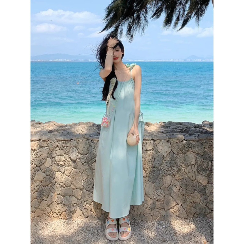 薄荷曼波风法式 粉色吊带连衣裙女春夏多巴胺三亚海边度假沙滩长裙