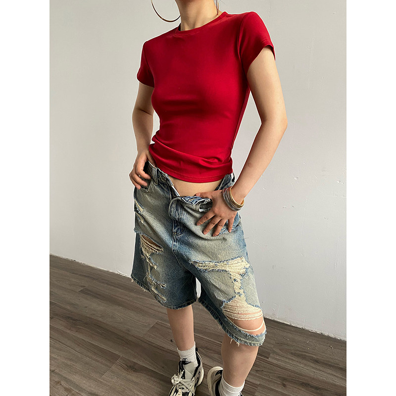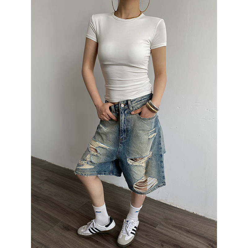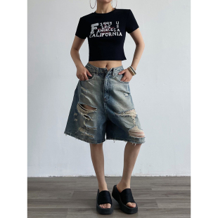 直筒高腰牛仔裤 复古水洗七分破洞阔腿裤 美式 AcupStudio江右上