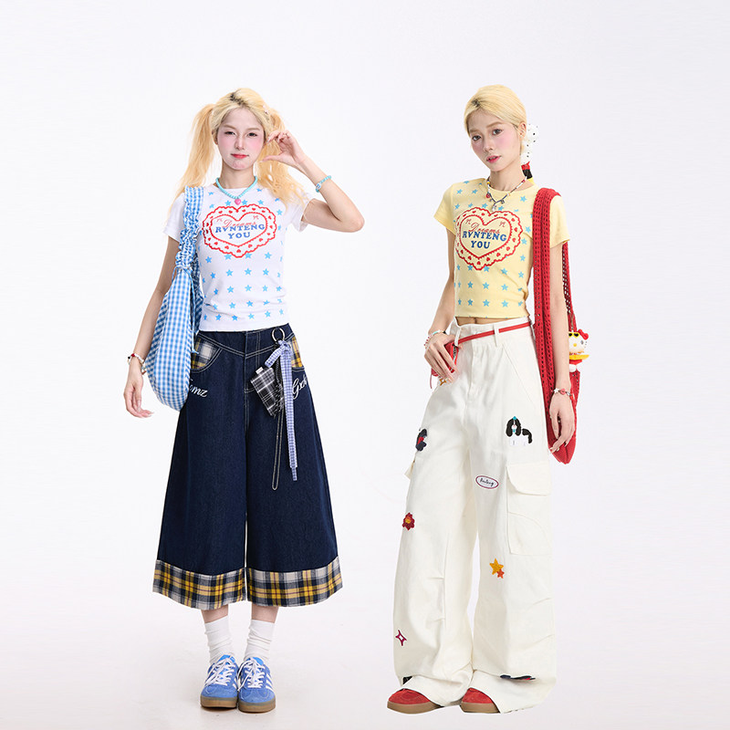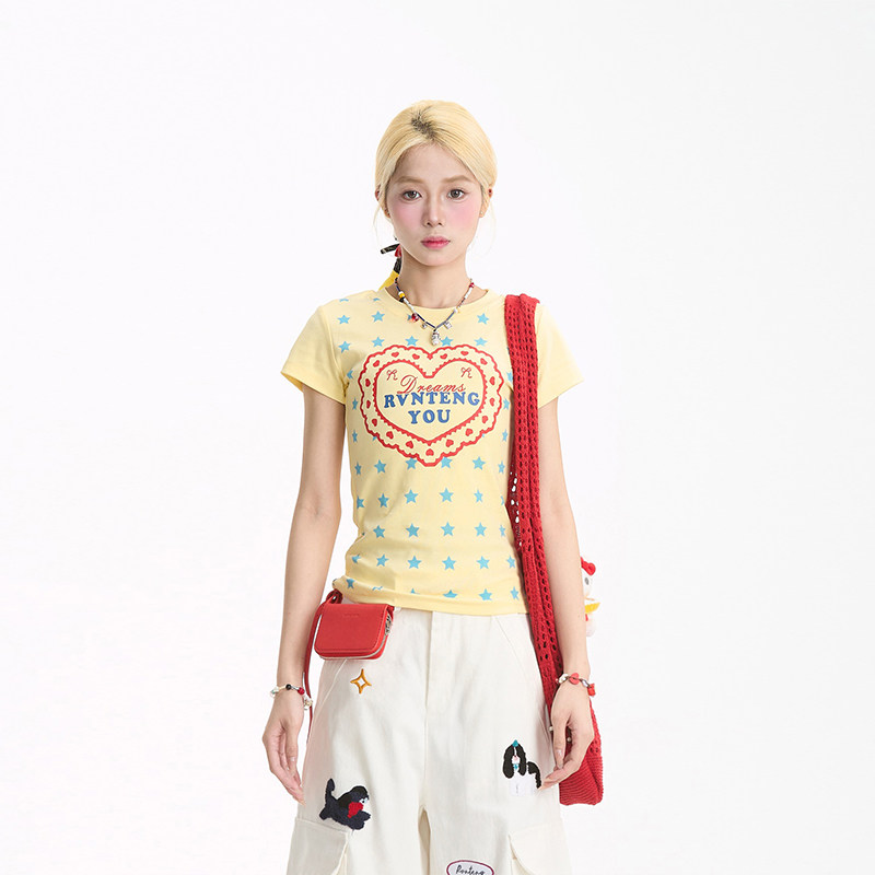 短袖 甜辣修身 女夏季 T恤美式 正肩显瘦上衣 新款 NERESUM爱心星星短款