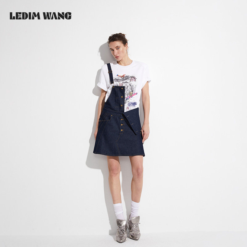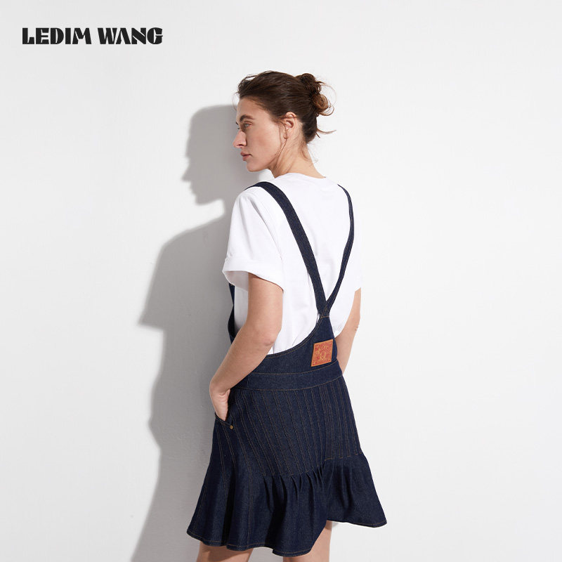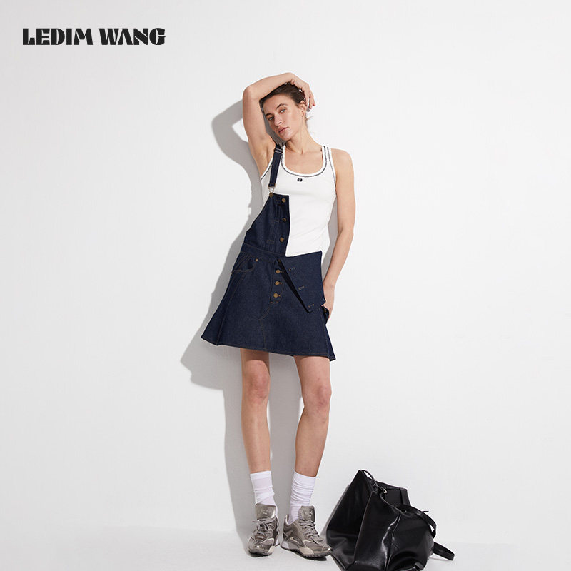 LEDIM 深色休闲短裙 WANG背带牛仔连衣裙女小众设计高级感春夏新款