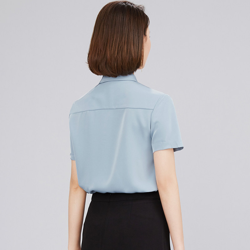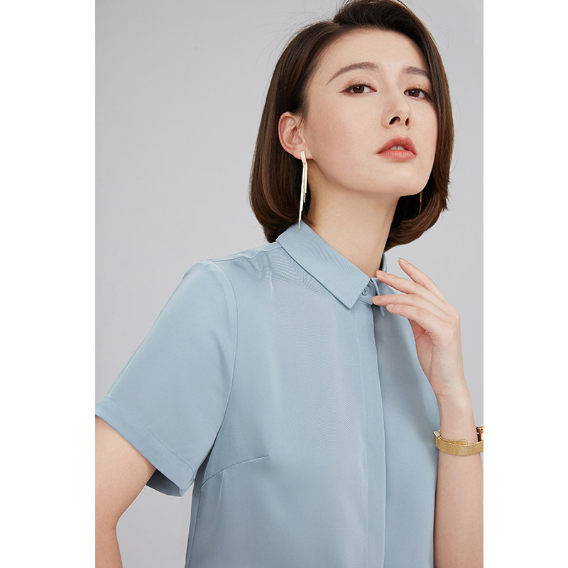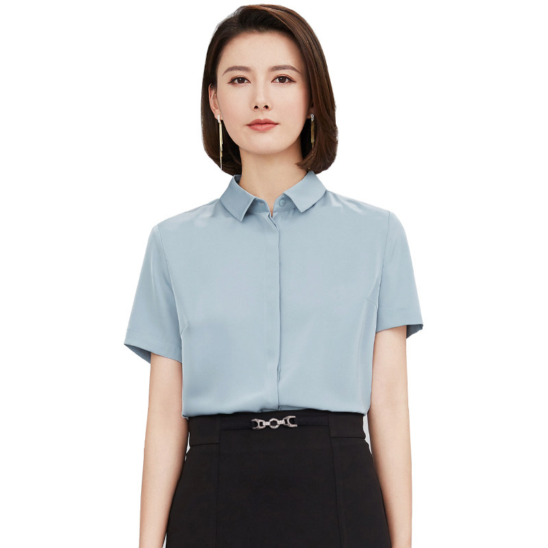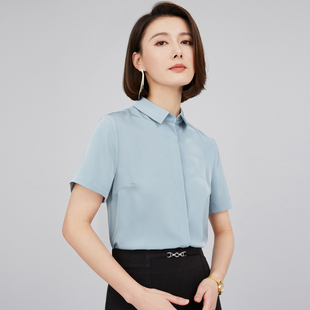 气质高端正装 璐丝百丽蓝色雪纺衬衫 职业新款 衬衣薄款 上衣 女夏短袖