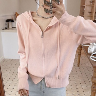 气质帽衫 连帽双拉链软糯长袖 时尚 毛衣外套女春季 休闲上衣 针织开衫