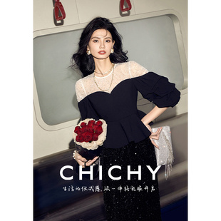 意大利设计 女秋款 CHICHY经典 宫廷风假两件小衫 黑色显瘦上衣 款