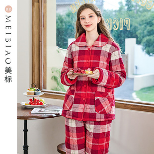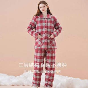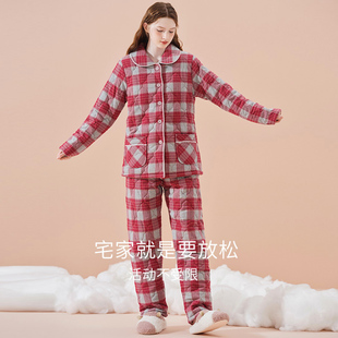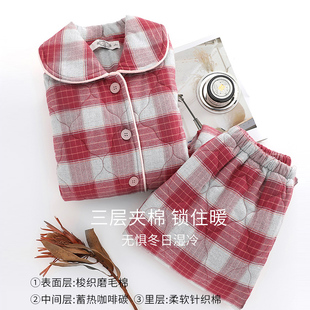 美标新款 女秋冬休闲格子全棉家居服 三层加厚保暖夹棉纯棉睡衣套装