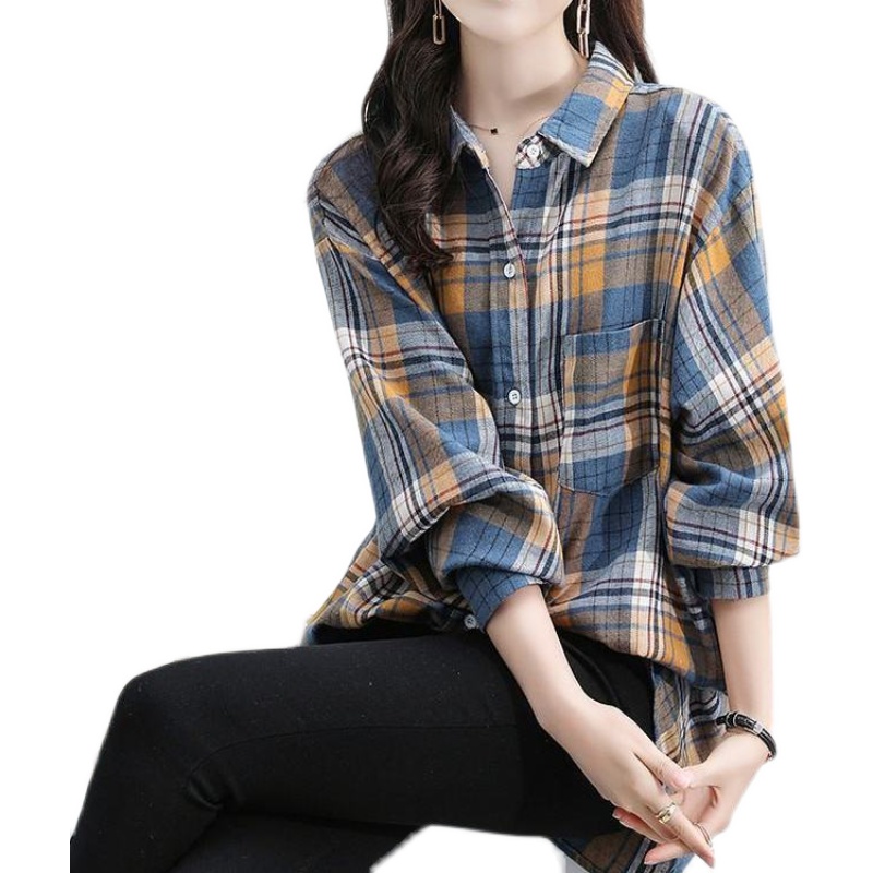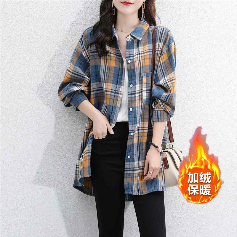 衬衣女 女外套春秋不加绒宽松格纹中长款 加绒加厚磨毛格子长袖 衬衫