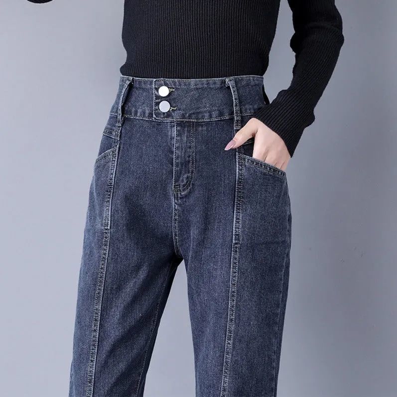 胖mm小脚显瘦裤 女黑色双扣高腰加厚弹力大码 子 保暖加绒牛仔裤 冬季