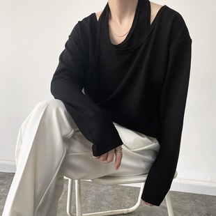 T恤男韩版 假两件双层领子小众长袖 宽松内搭设计感卫衣潮 个性 秋季