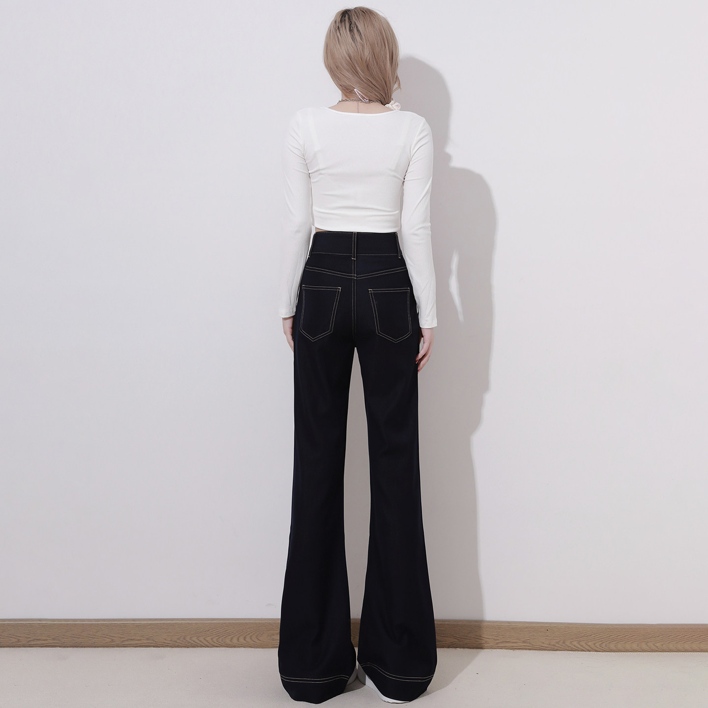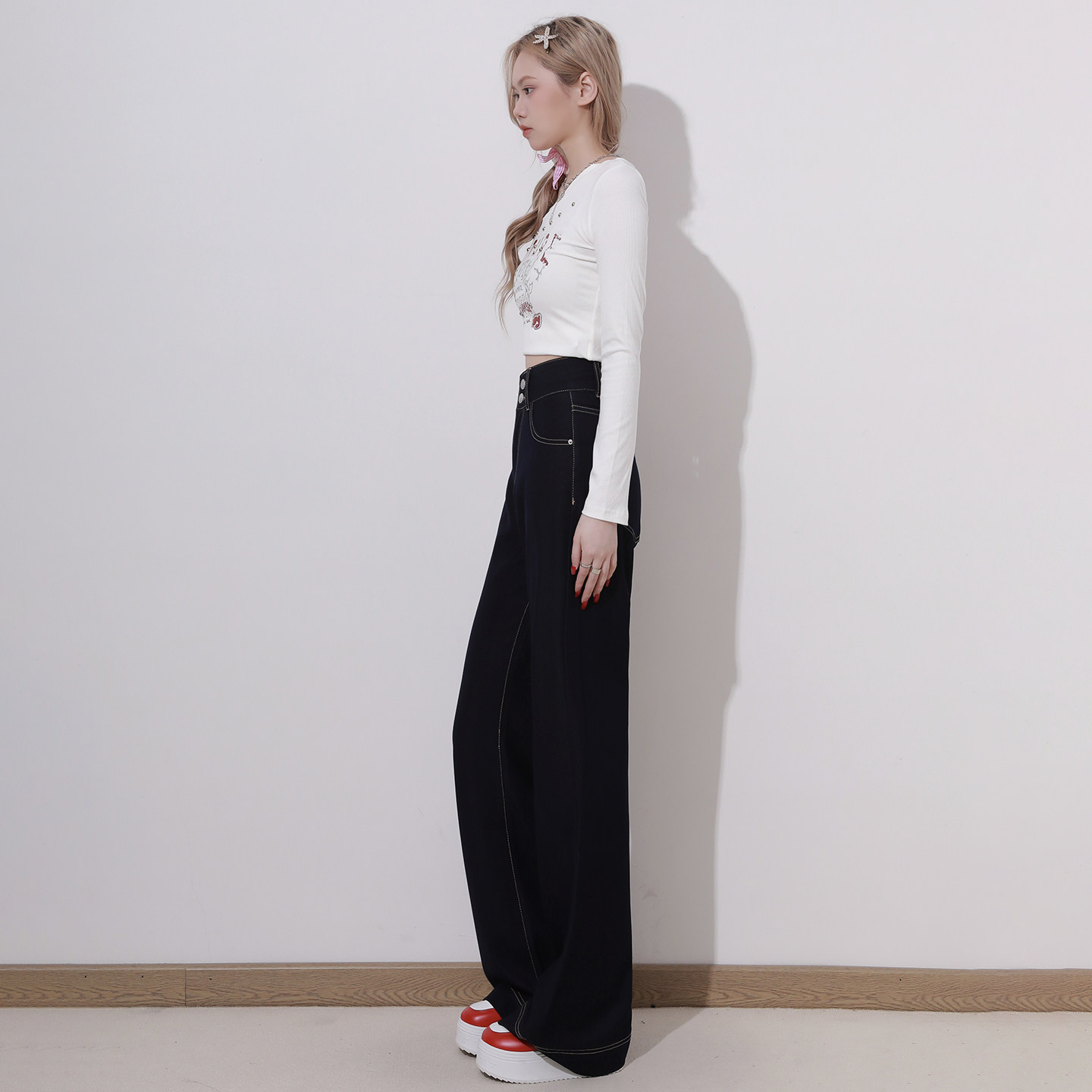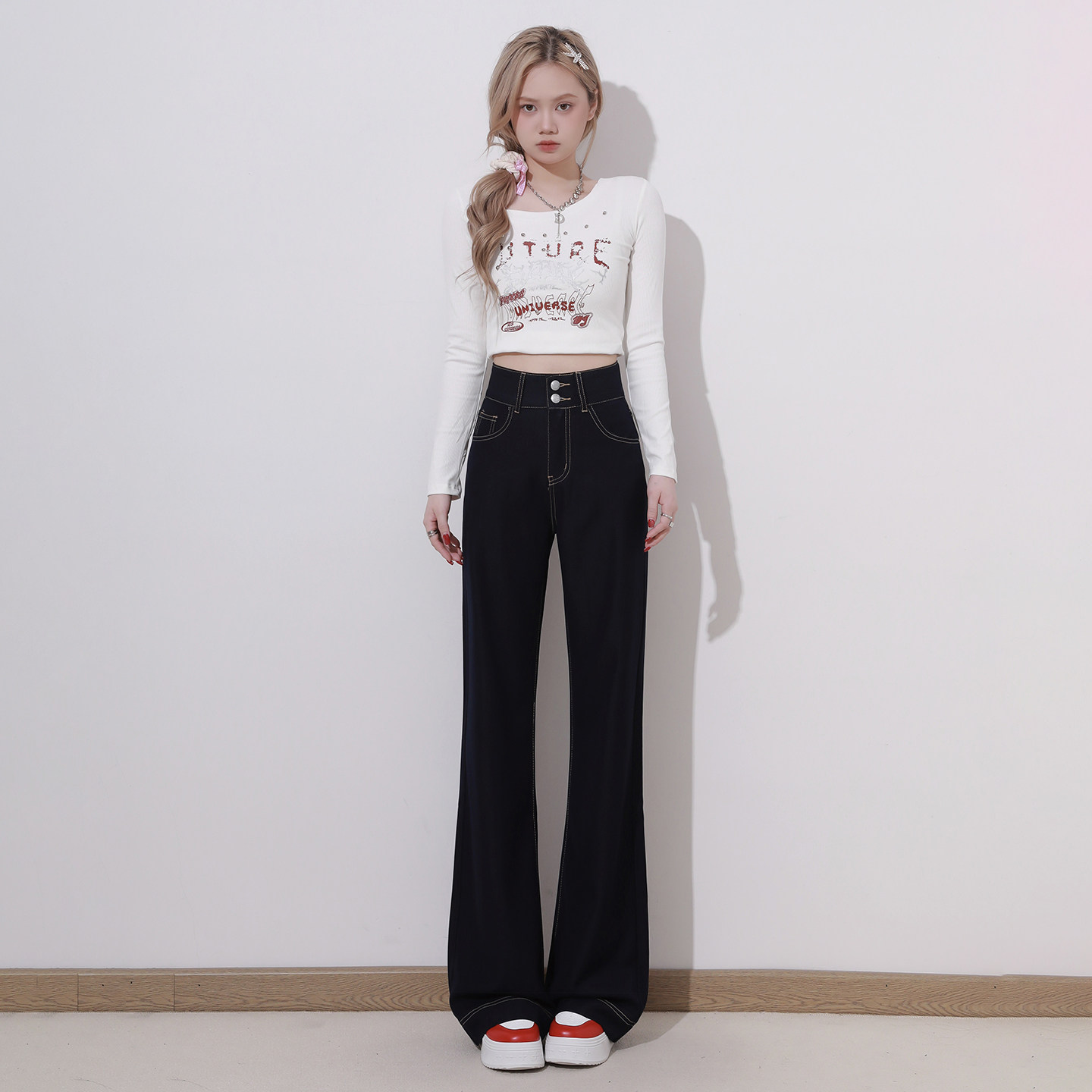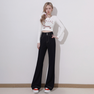 长裤 艾格丹宁蓝双扣不贴腿微喇叭牛仔裤 高腰拖地裤 美式 女2026春季