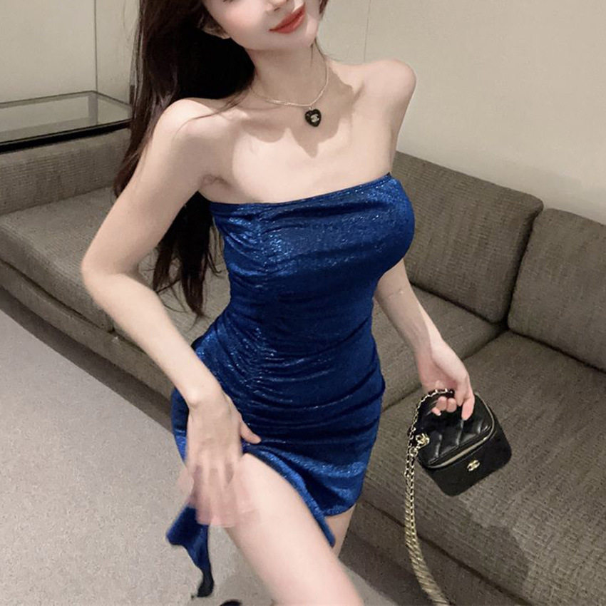 高级感抹胸连衣裙女春开叉收腰显瘦不规则抽褶包臀裙 月销10万