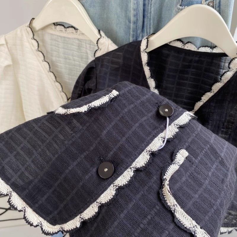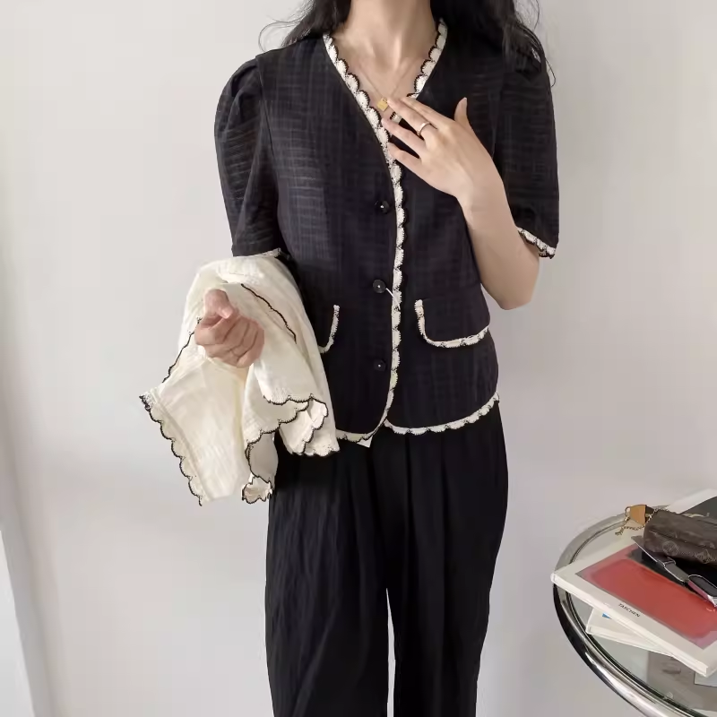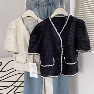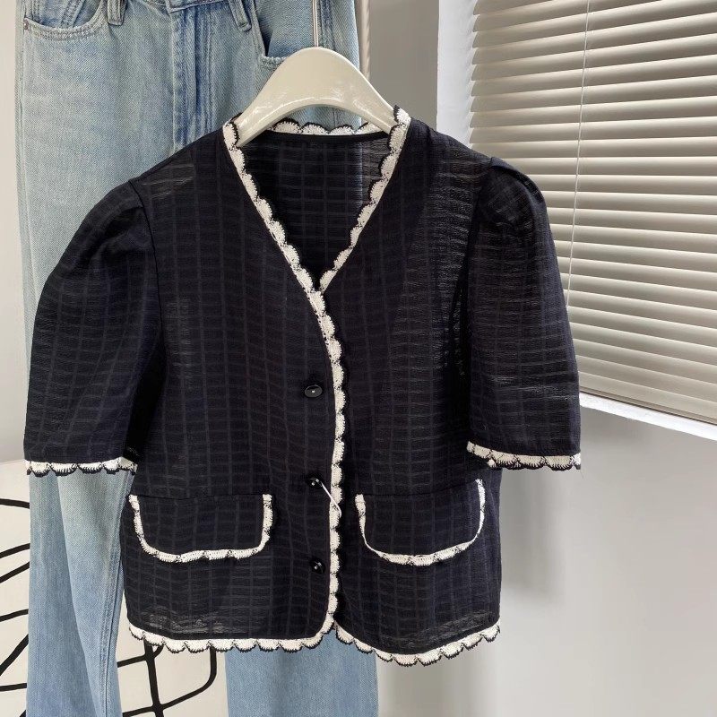上衣开衫 编织月牙肌理感显瘦V领单排扣短袖 5752 0.11KG 包邮