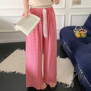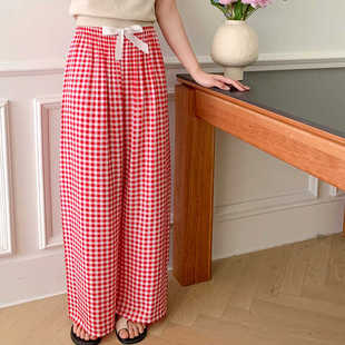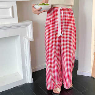 大红格子女人造棉慵懒格纹外穿直筒休闲宽松阔腿裤 棉绸睡裤 夏薄款
