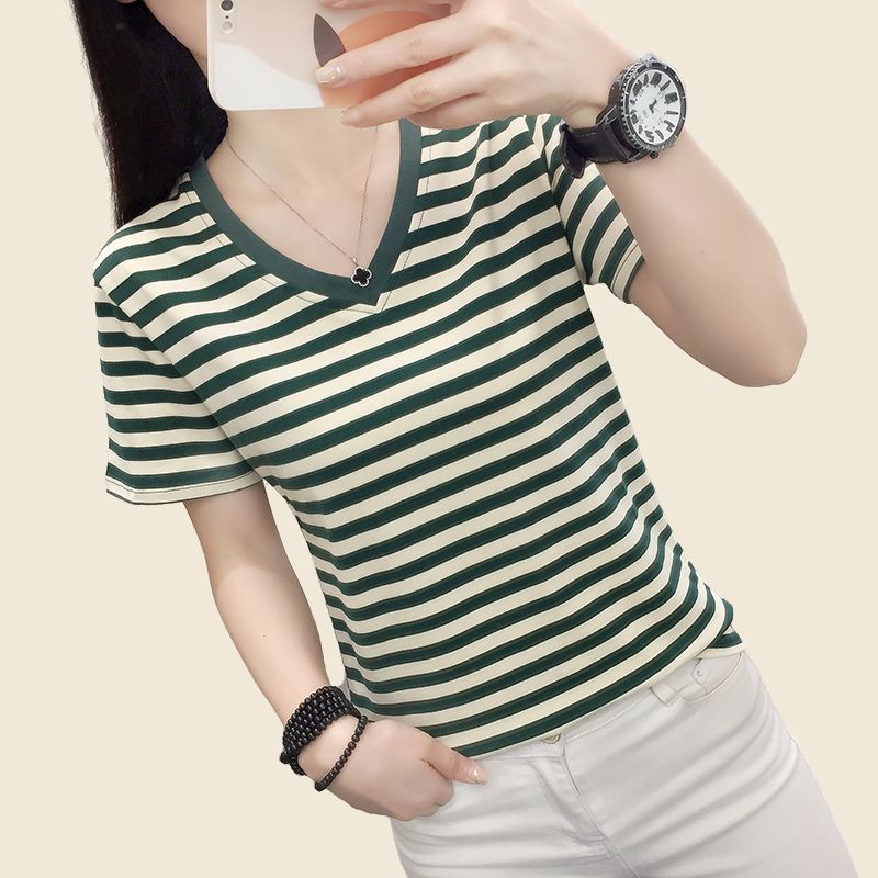 显瘦V领上衣半袖 纯棉短袖 条纹中年妈妈宽松大码 新款 减龄 T恤女夏装