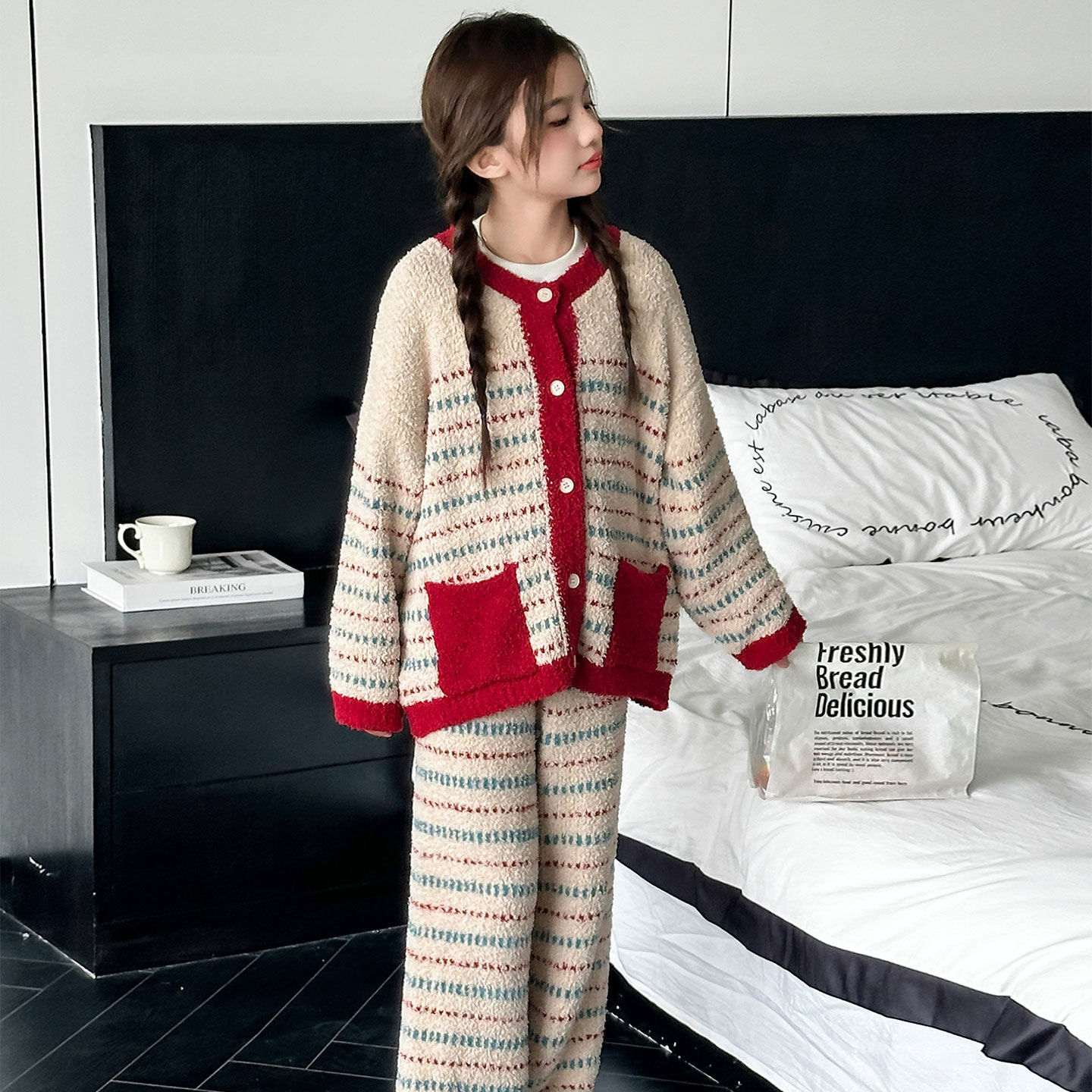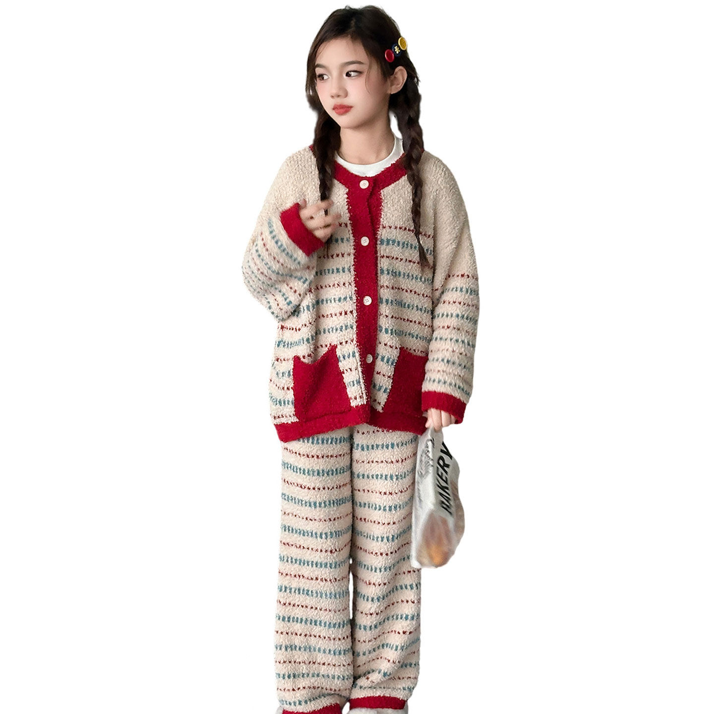 家居服套装 长裤 草莓条纹睡衣女秋冬加厚夹棉长袖 馨帮帮Homedress