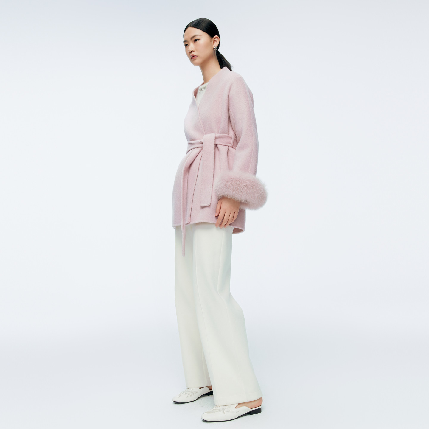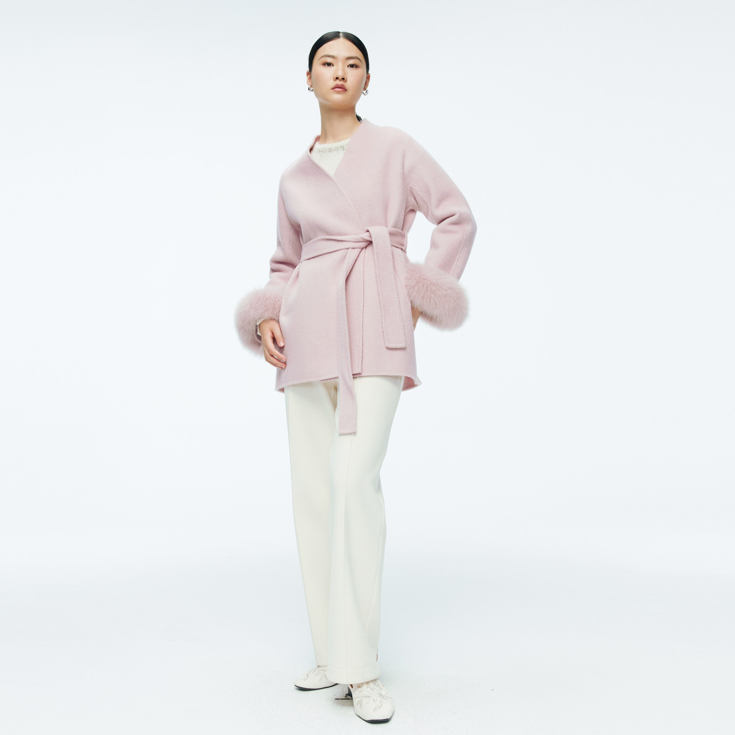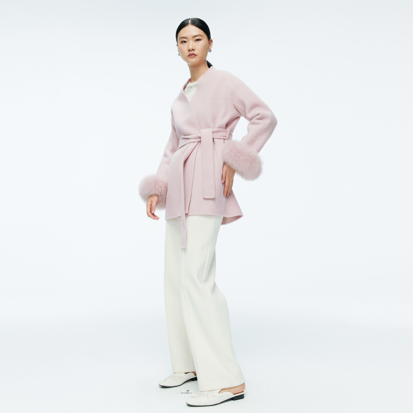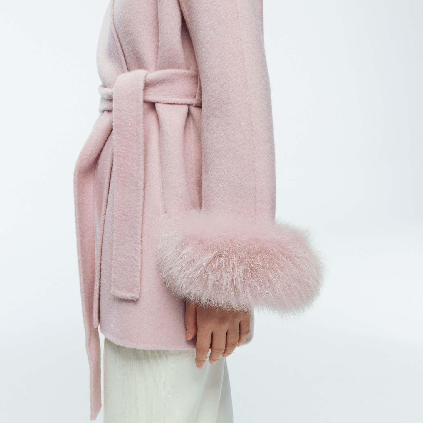 系腰带双面呢毛呢大衣1244C17JN4 冰粉色中长款 婉甸2025年冬季 新品