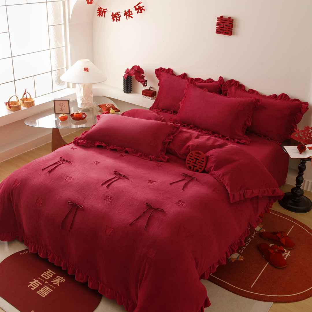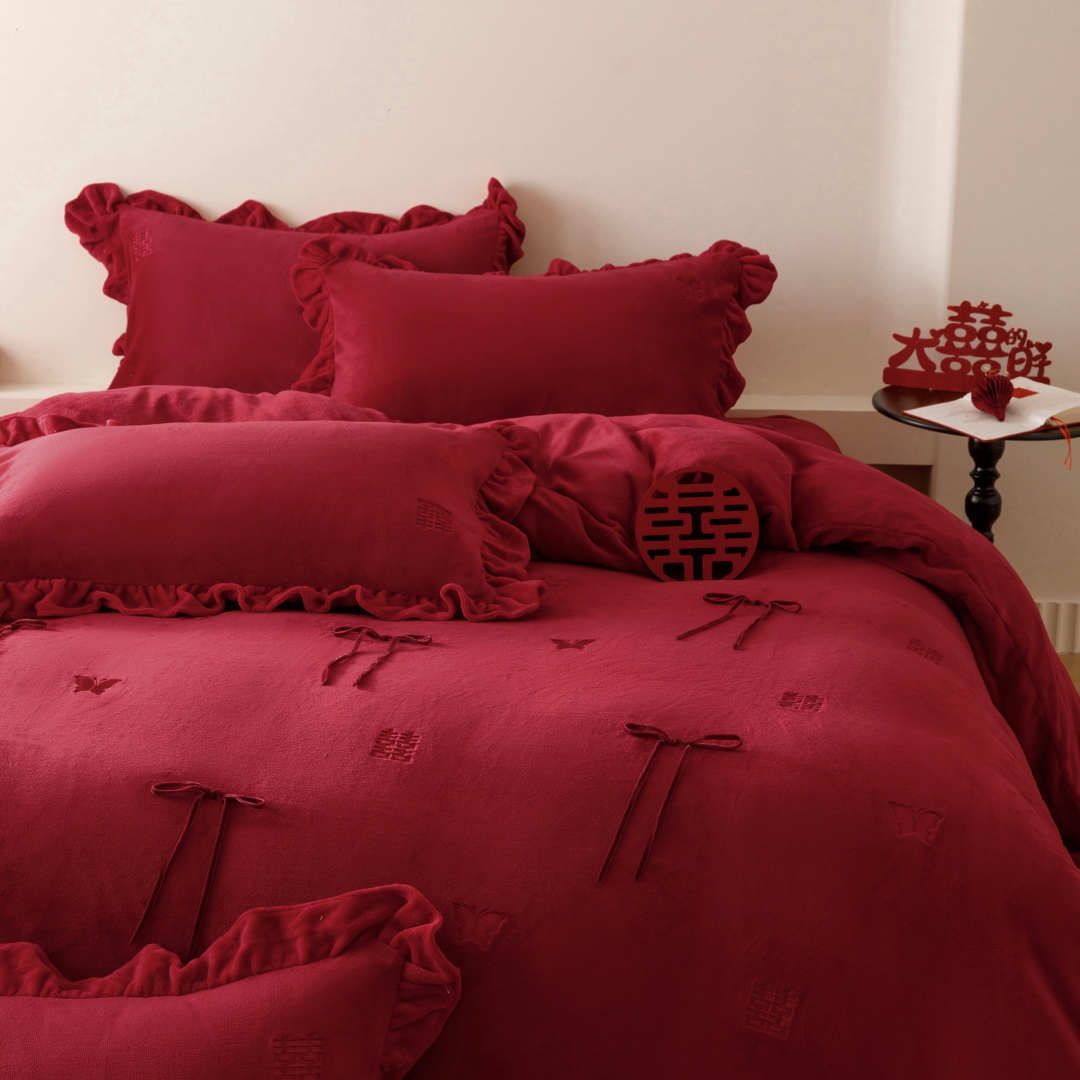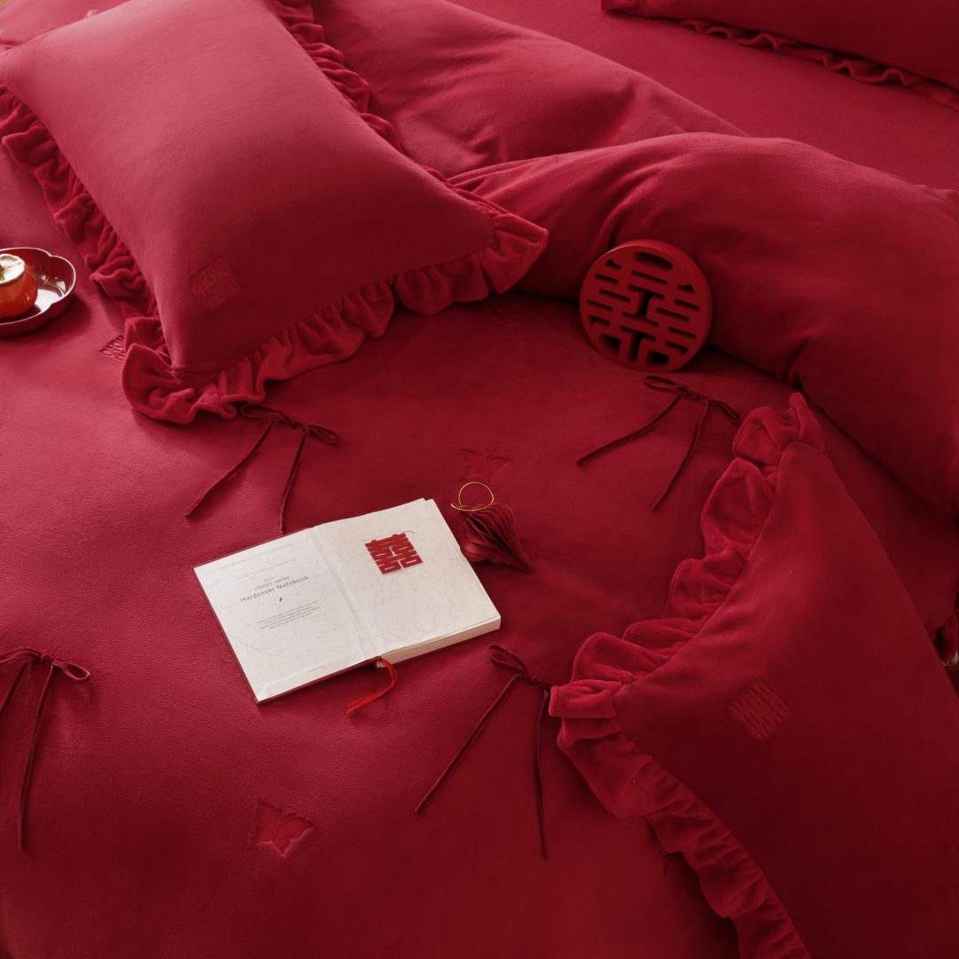 法式 牛奶绒四件套加厚保暖珊瑚绒法兰绒结婚被套床笠 浪漫婚庆冬季