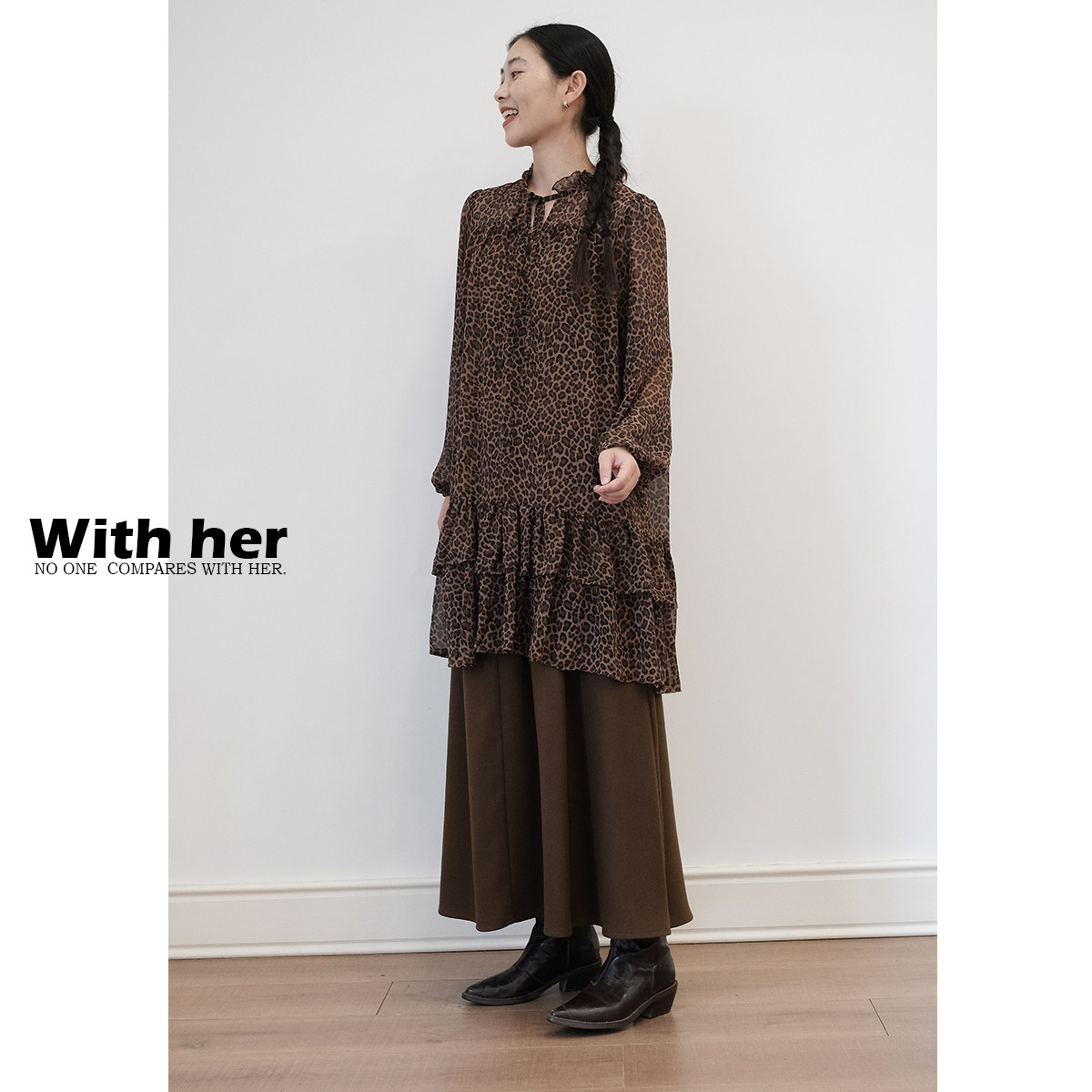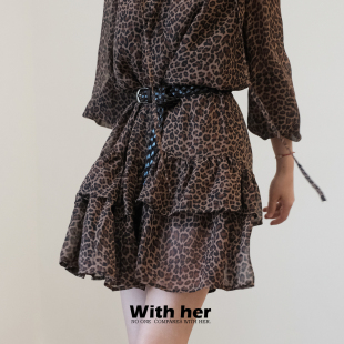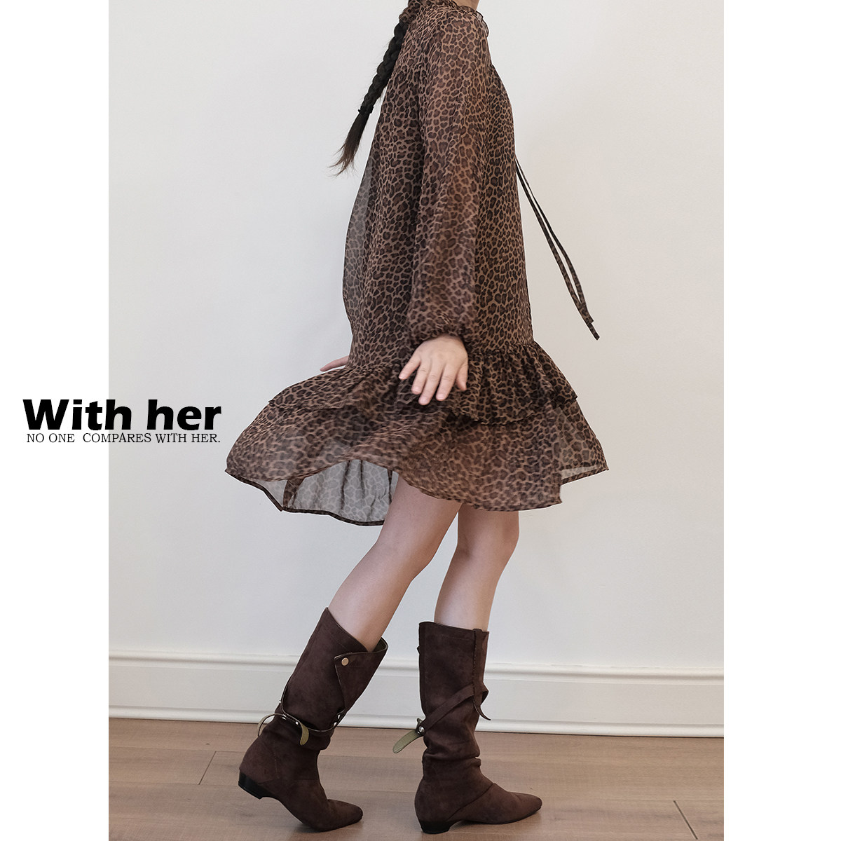 与她原创小众设计复古豹纹印花系带荷叶边废土秋冬长袖 连衣裙短裙