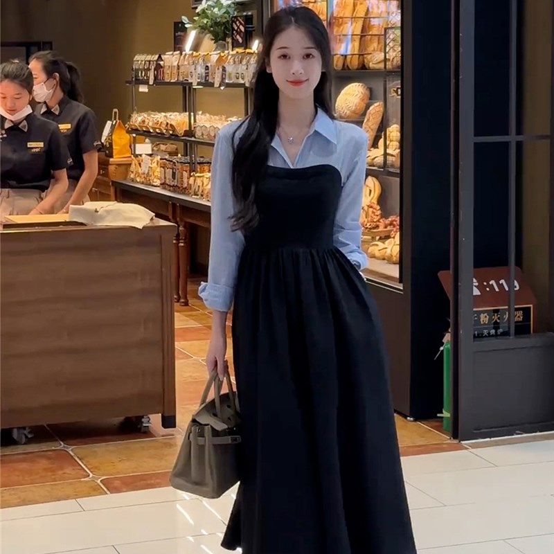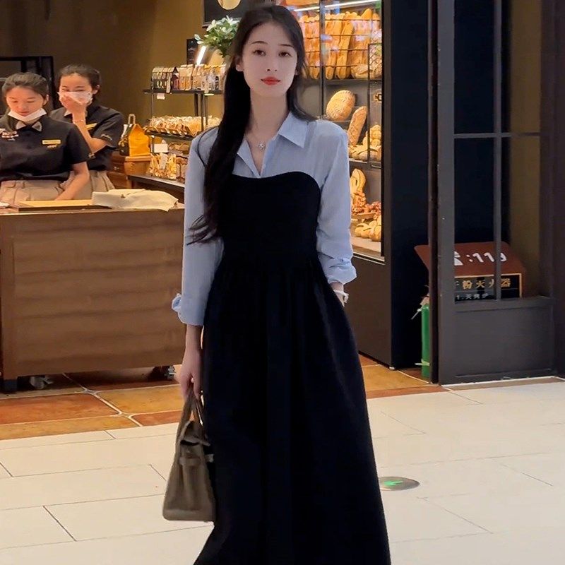 新款 吊带连衣裙女2025冬季 拼接抹胸a字裙生日裙子 法式 灰尘邓邓