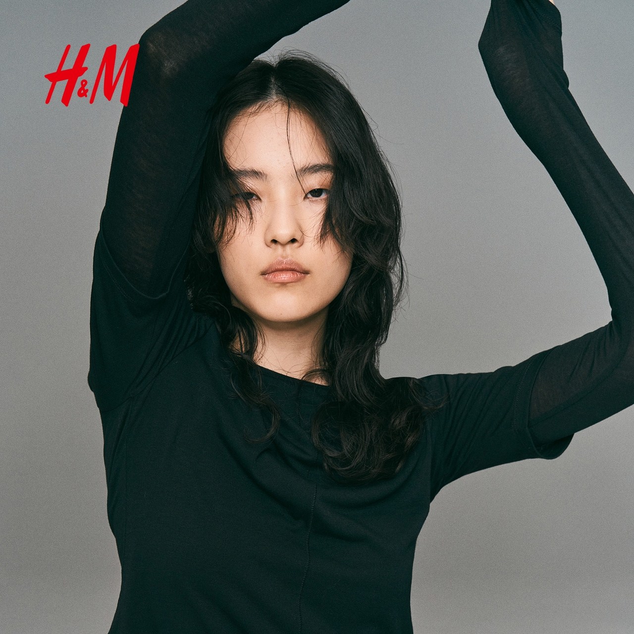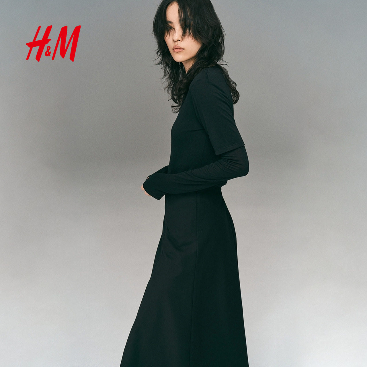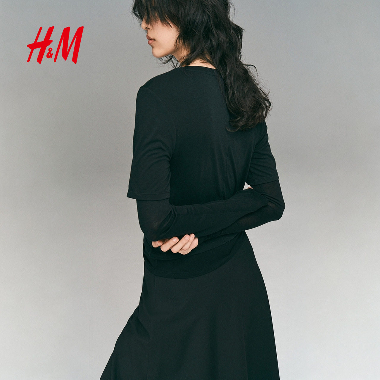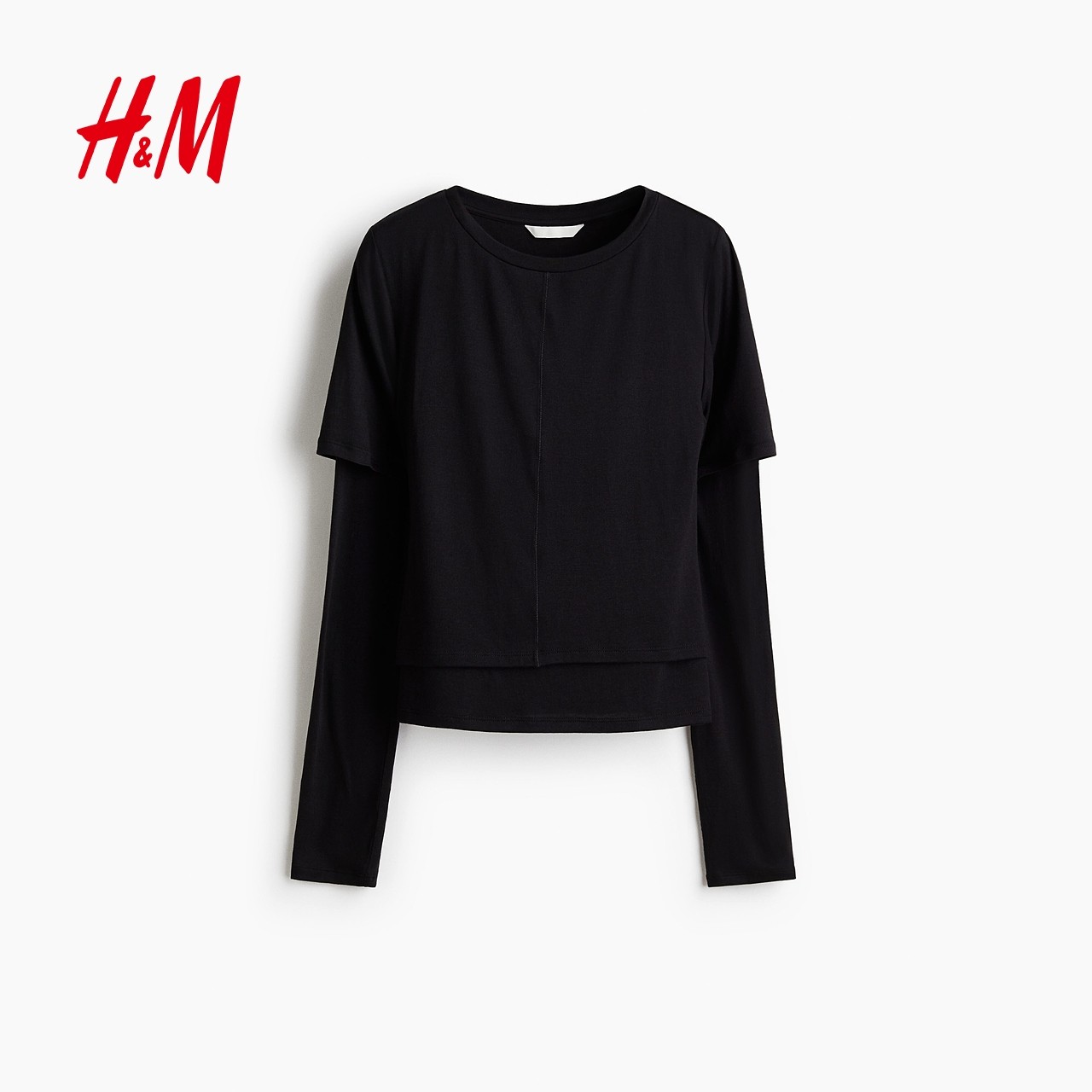 修身 新款 圆领假两件舒适双层汗布上衣1311919 T恤2025冬季 HM女装
