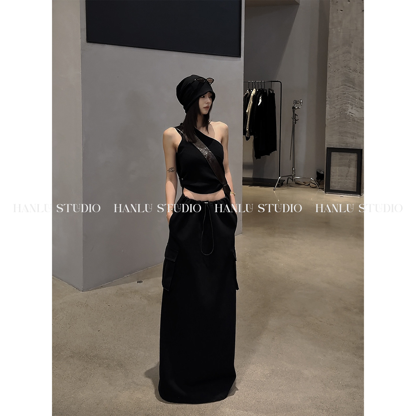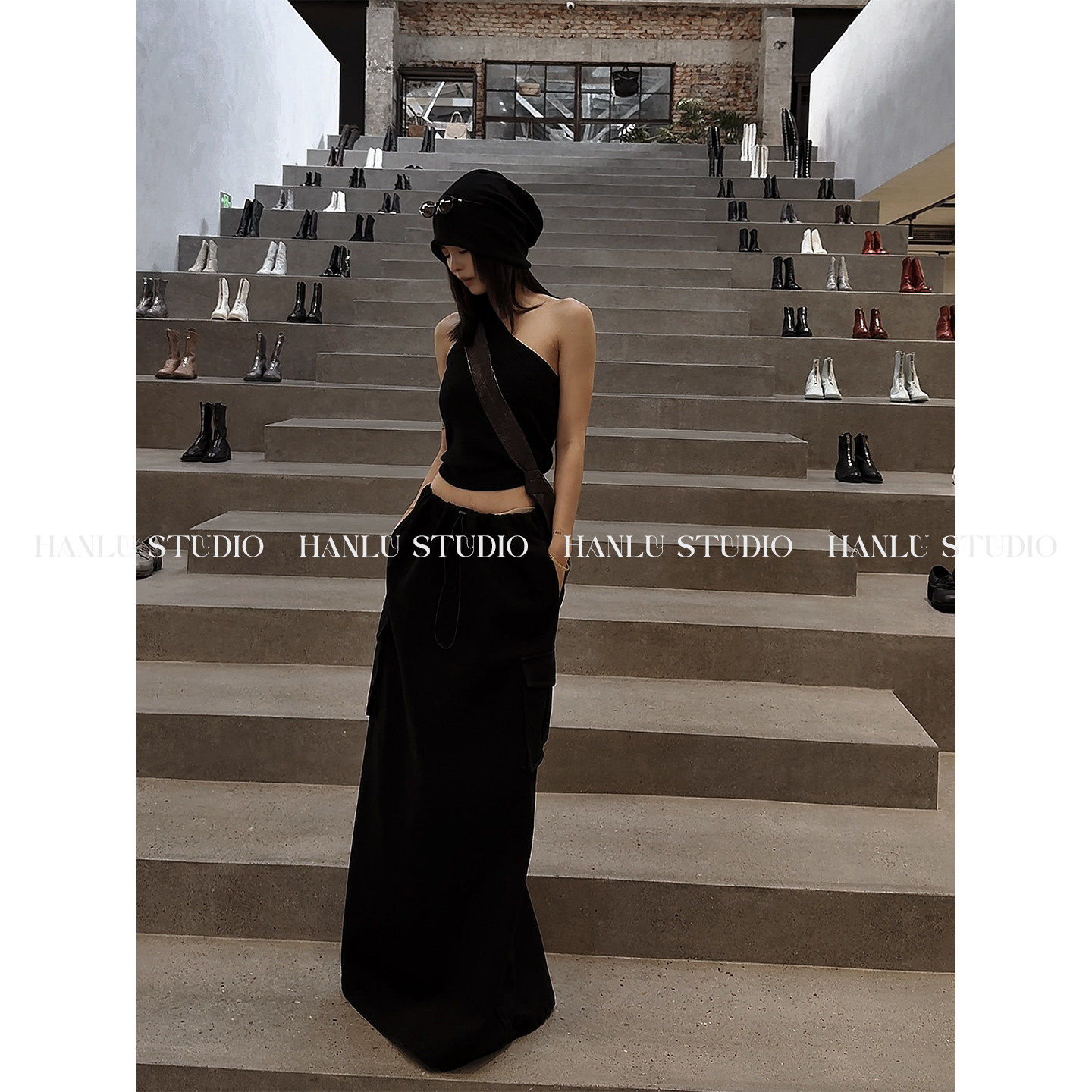 直筒牛仔黑色半身裙 长款 HanLu studio原创松紧低腰棉感宽松秋季