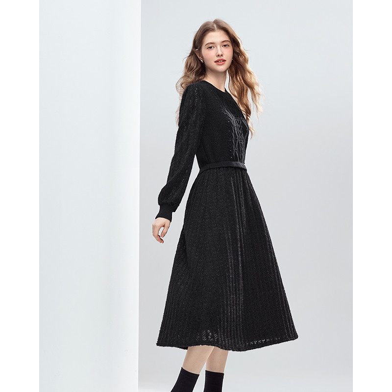 黑标 针织连衣裙优雅长袖 2025年冬季 黑色修身 裙女 新款 DPLAY