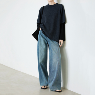 梨形身材胖mm宽松显瘦阔腿裤 加绒加厚大码 女冬季 蓝灰色直筒牛仔裤