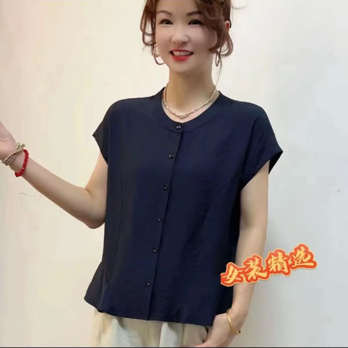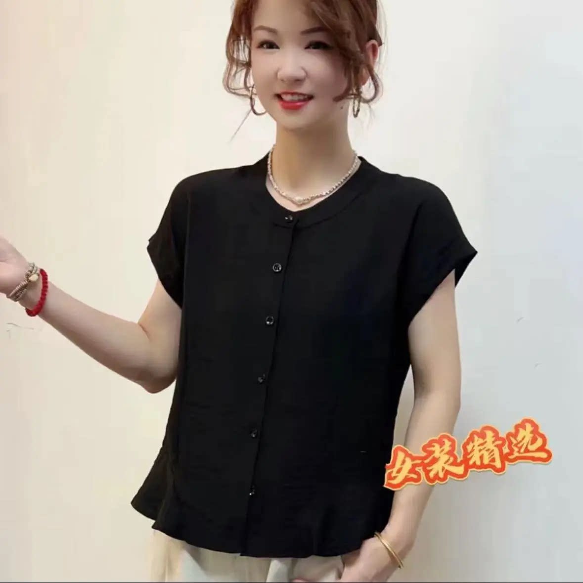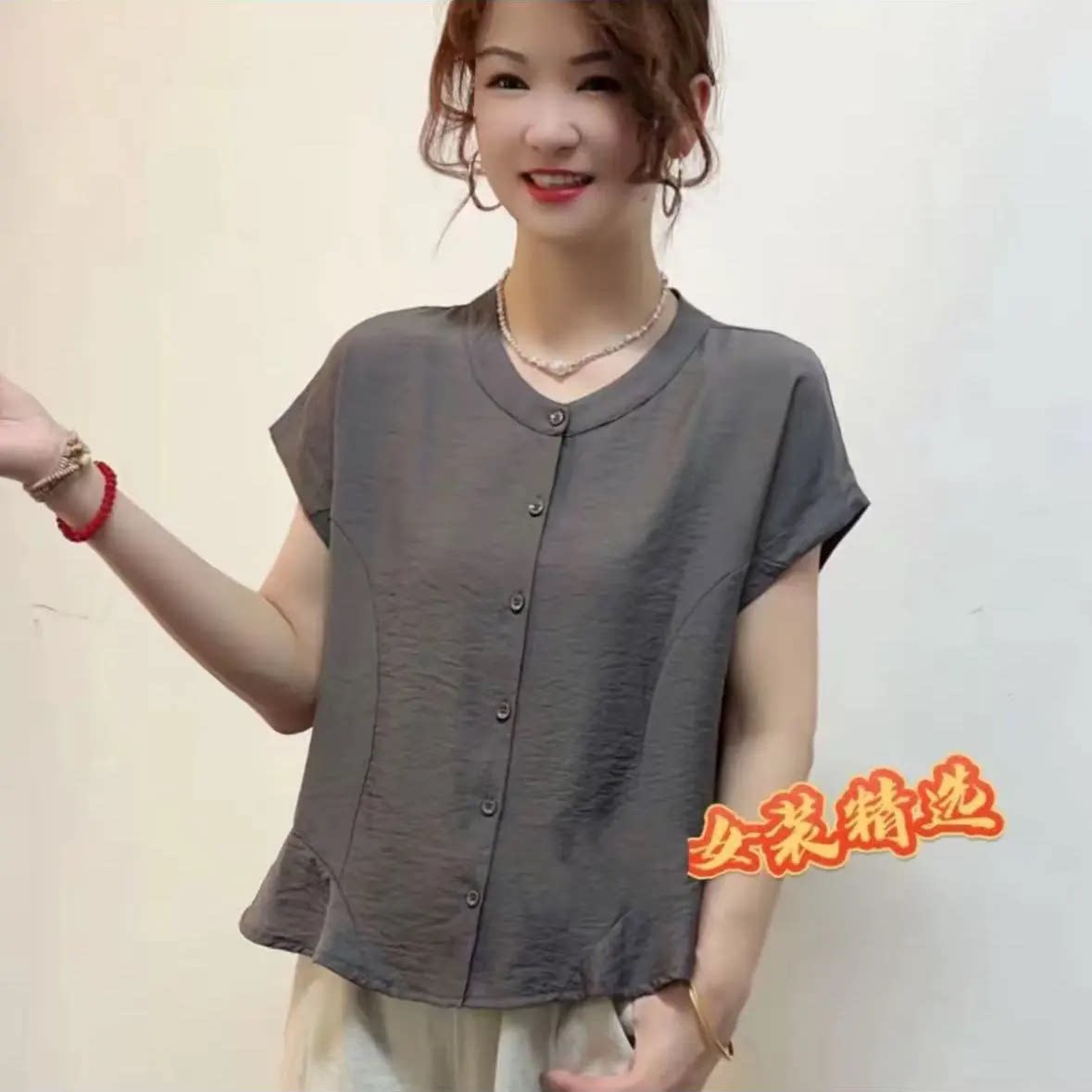 舒适短袖 天丝麻圆领纯色拼接薄款 开扣衬衣女上衣 新款 2025夏季