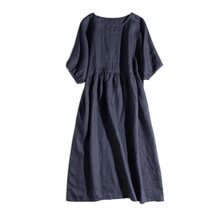 宽松裙子 连衣裙女2025夏季 文艺复古棉麻慵懒风纯色简约中长款 短袖