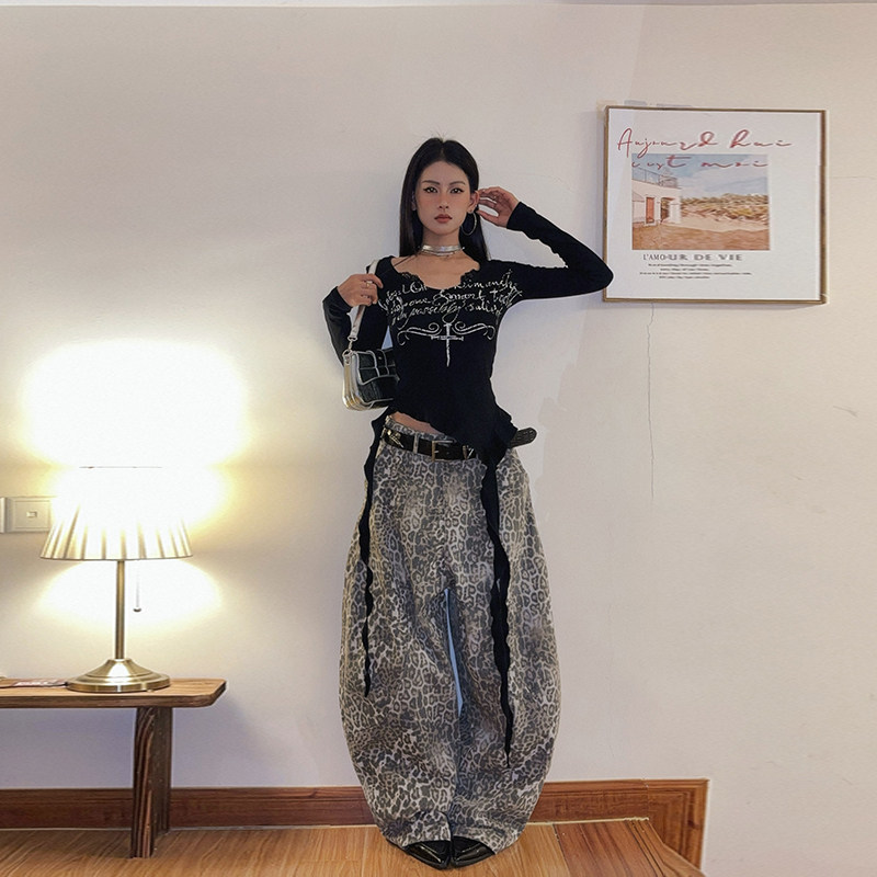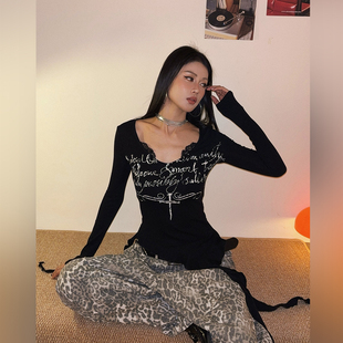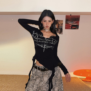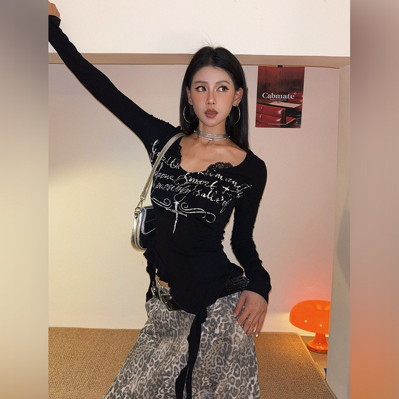 上衣 T恤女不规则打底修身 DoubleD美式 复古辣妹蕾丝拼接荷叶边长袖