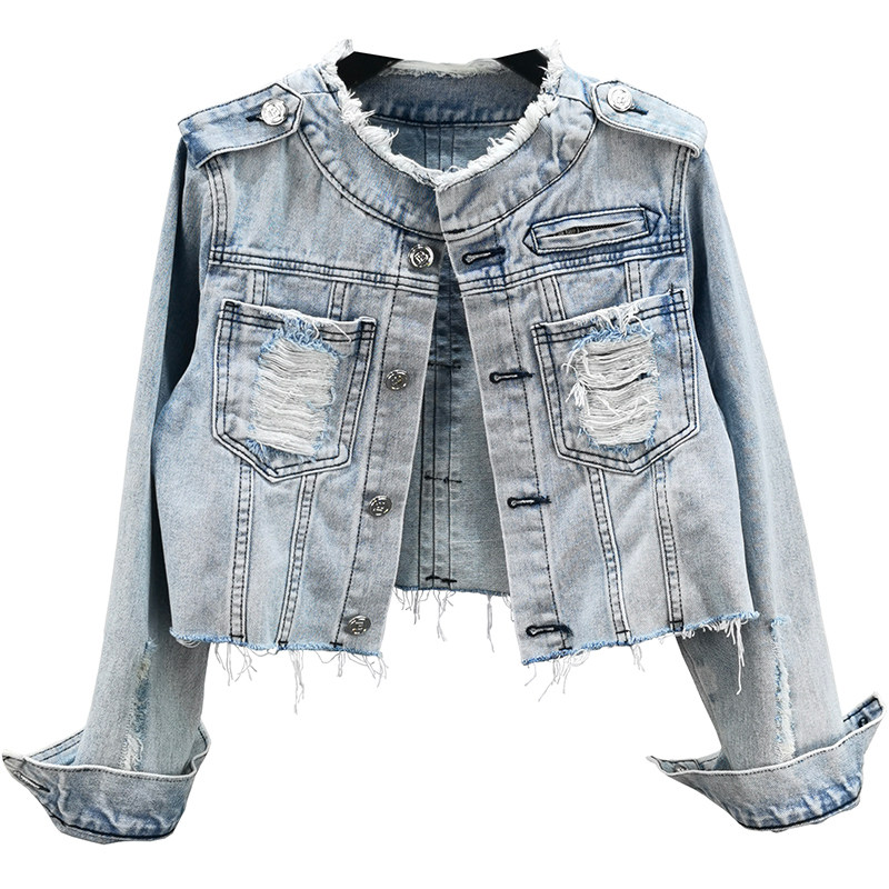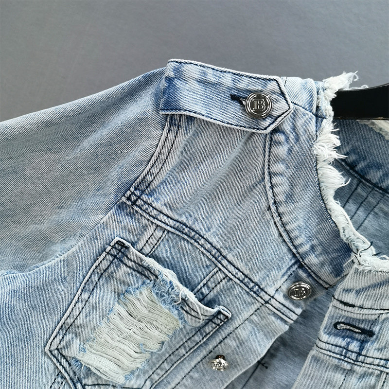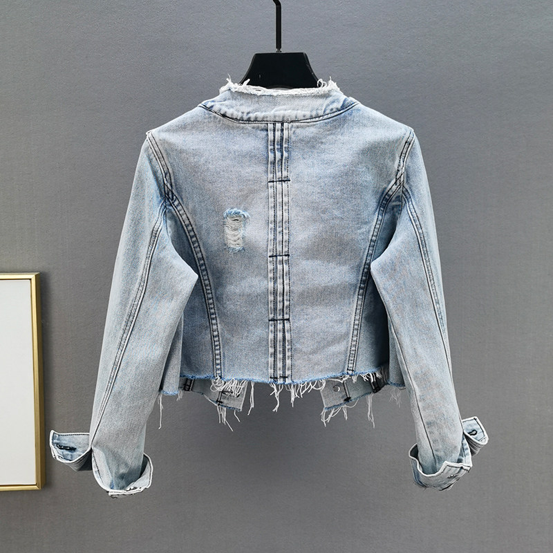 单排扣欧货浅蓝上衣 毛边显瘦修身 破洞牛仔短外套女2021早秋季 新款