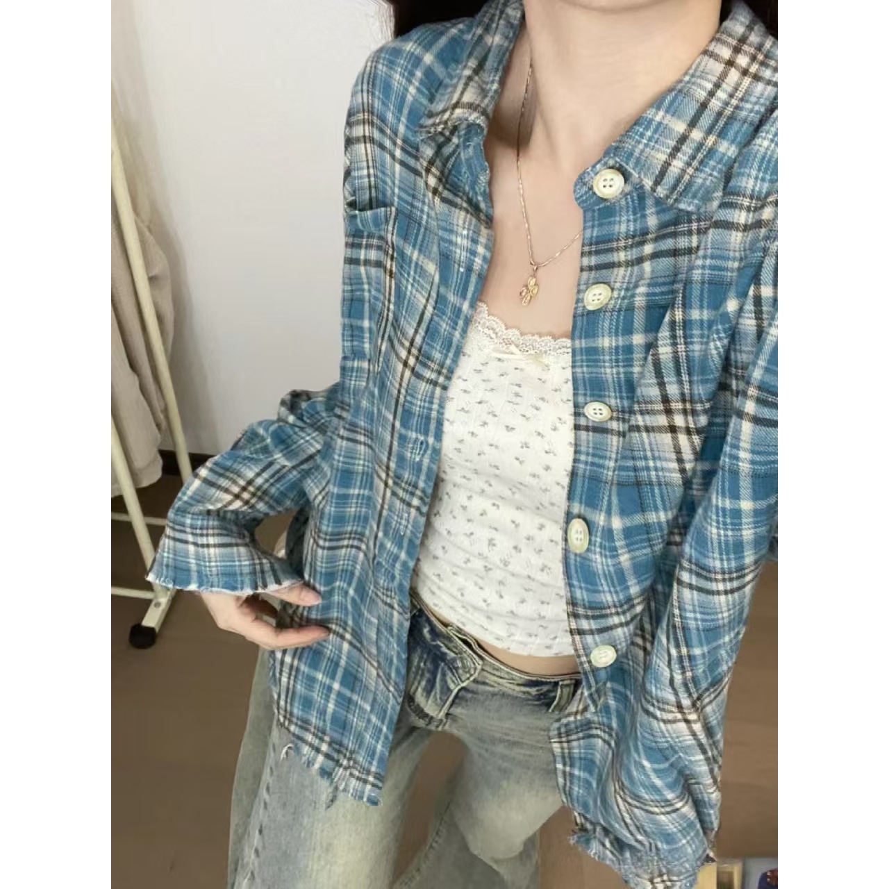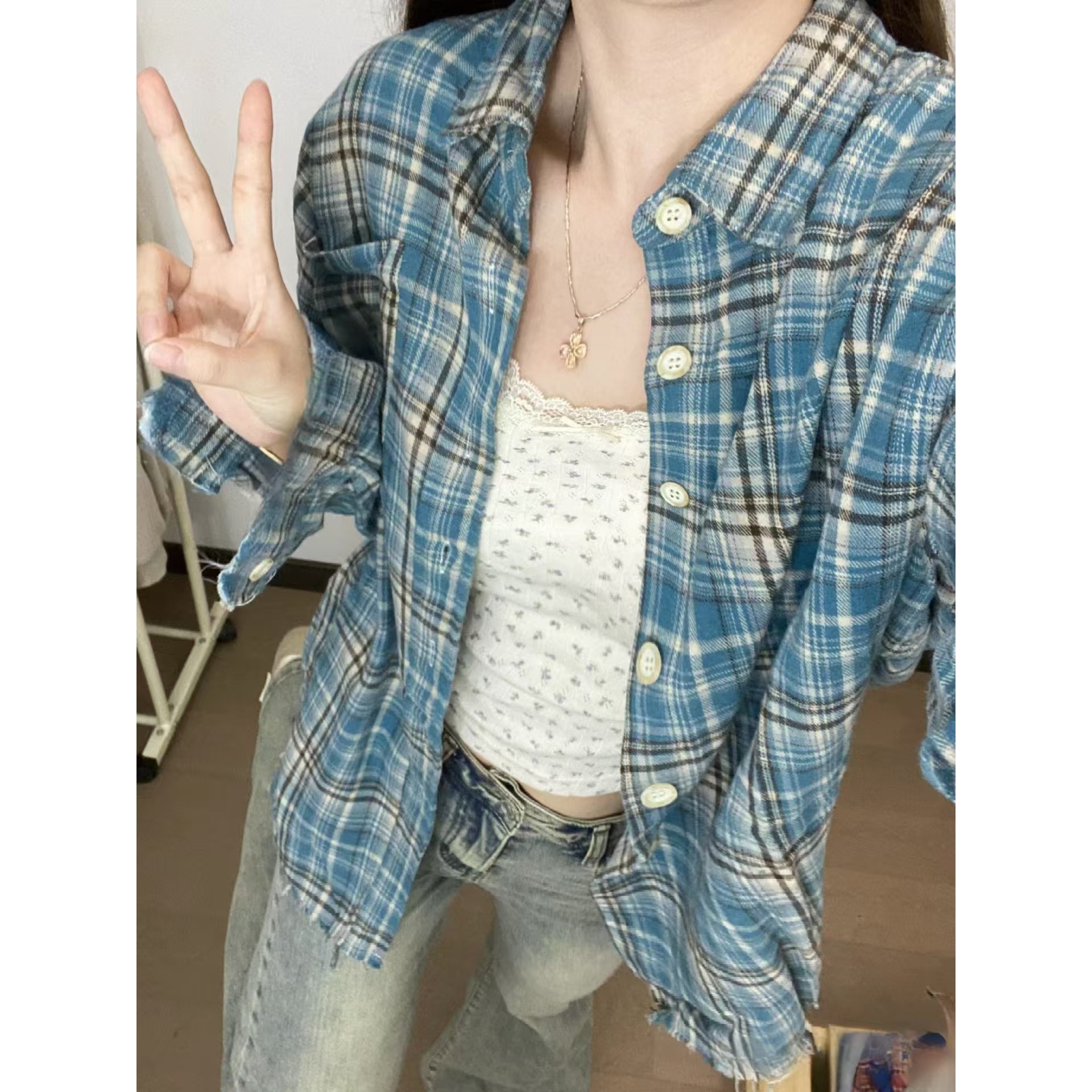 上衣外套氨纶 女春秋磨毛防晒衬衣慵懒风法式 韩系格纹复古长袖 衬衫