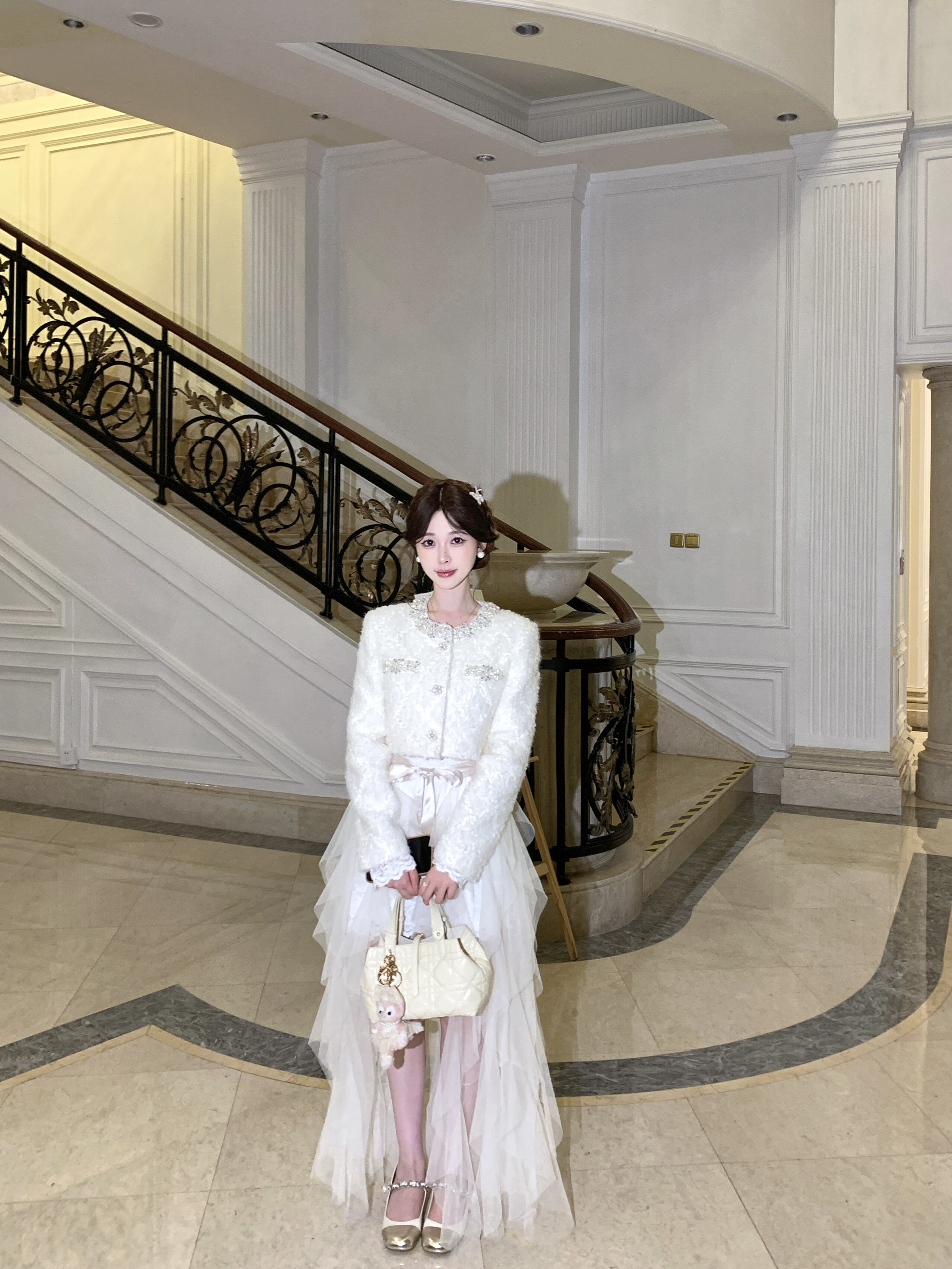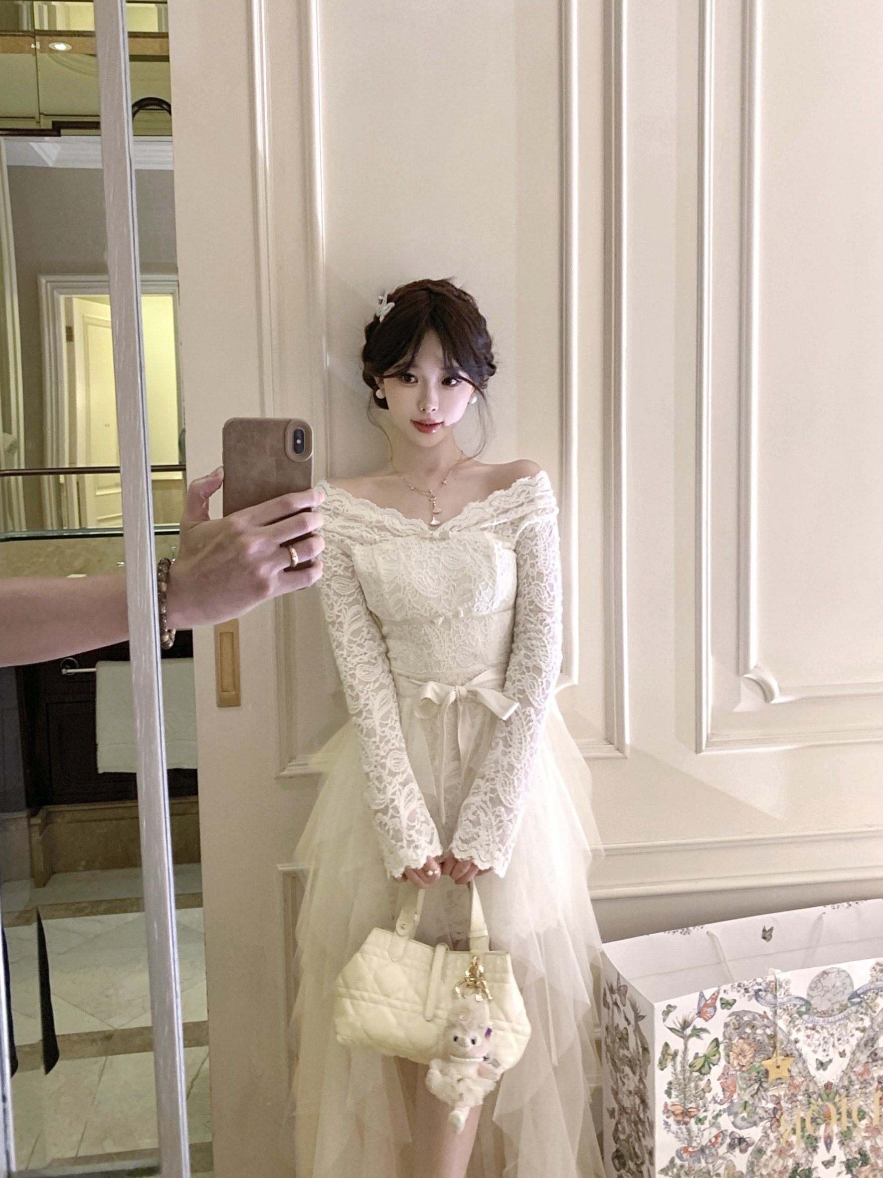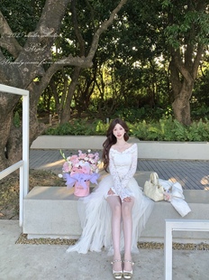 温柔风蕾丝网纱连衣裙小香风套装 新款 拖尾小礼裙 生日战裙 白里