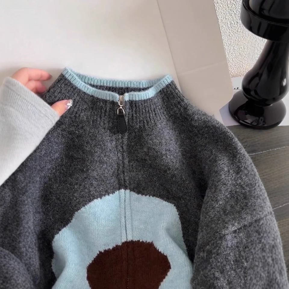 韩系撞色高级感拉链针织开衫 秋冬慵懒休闲百搭学院风软糯毛衣外套
