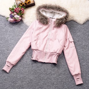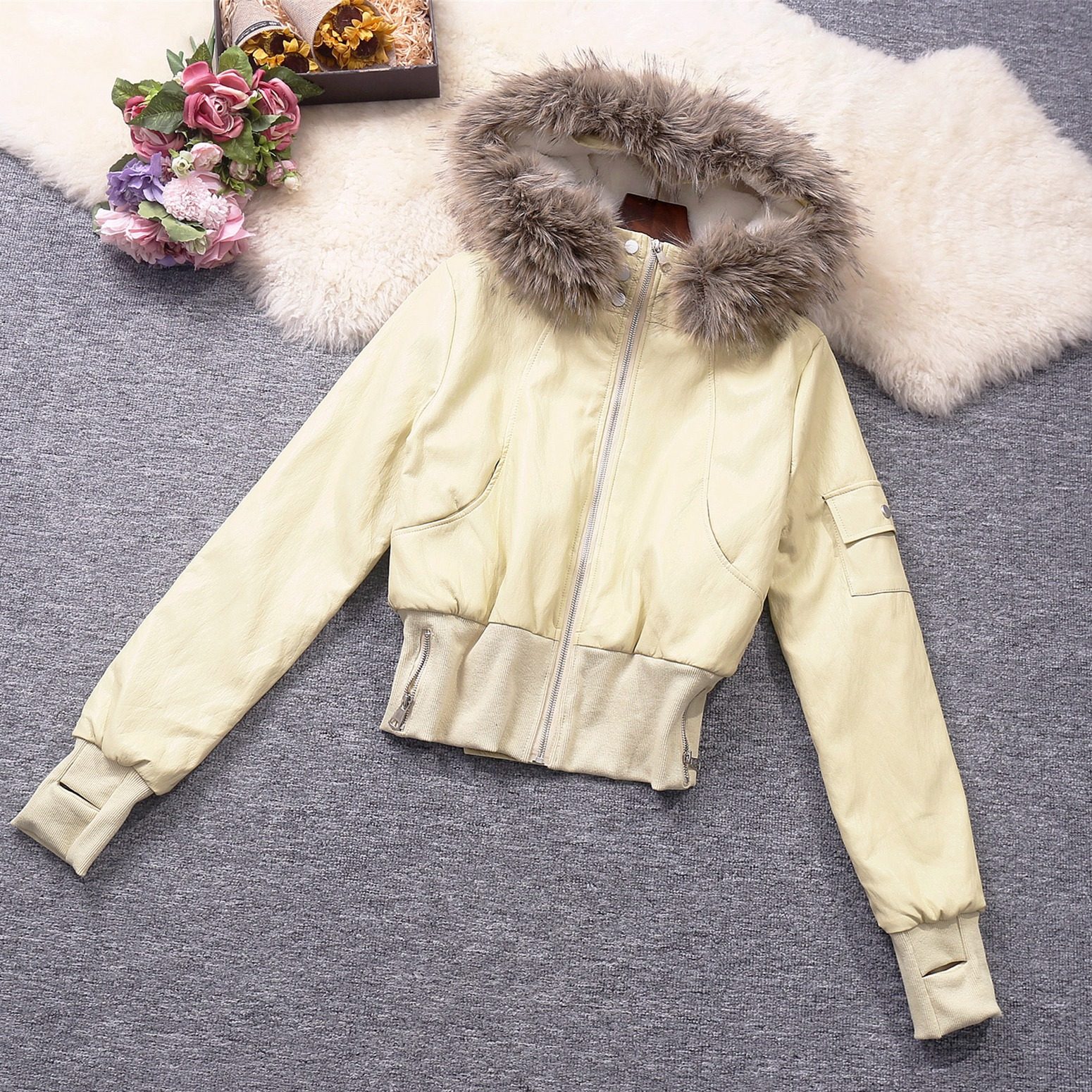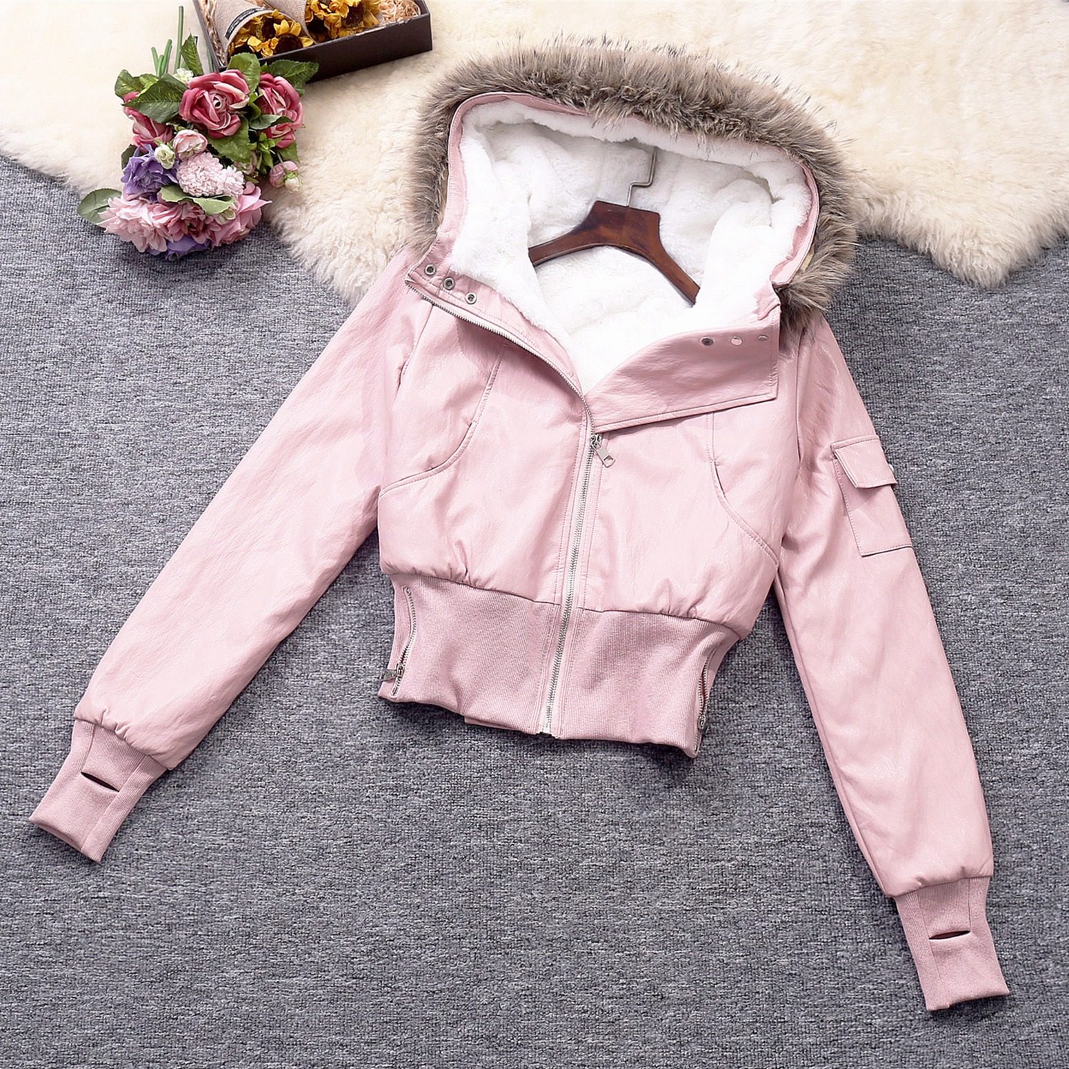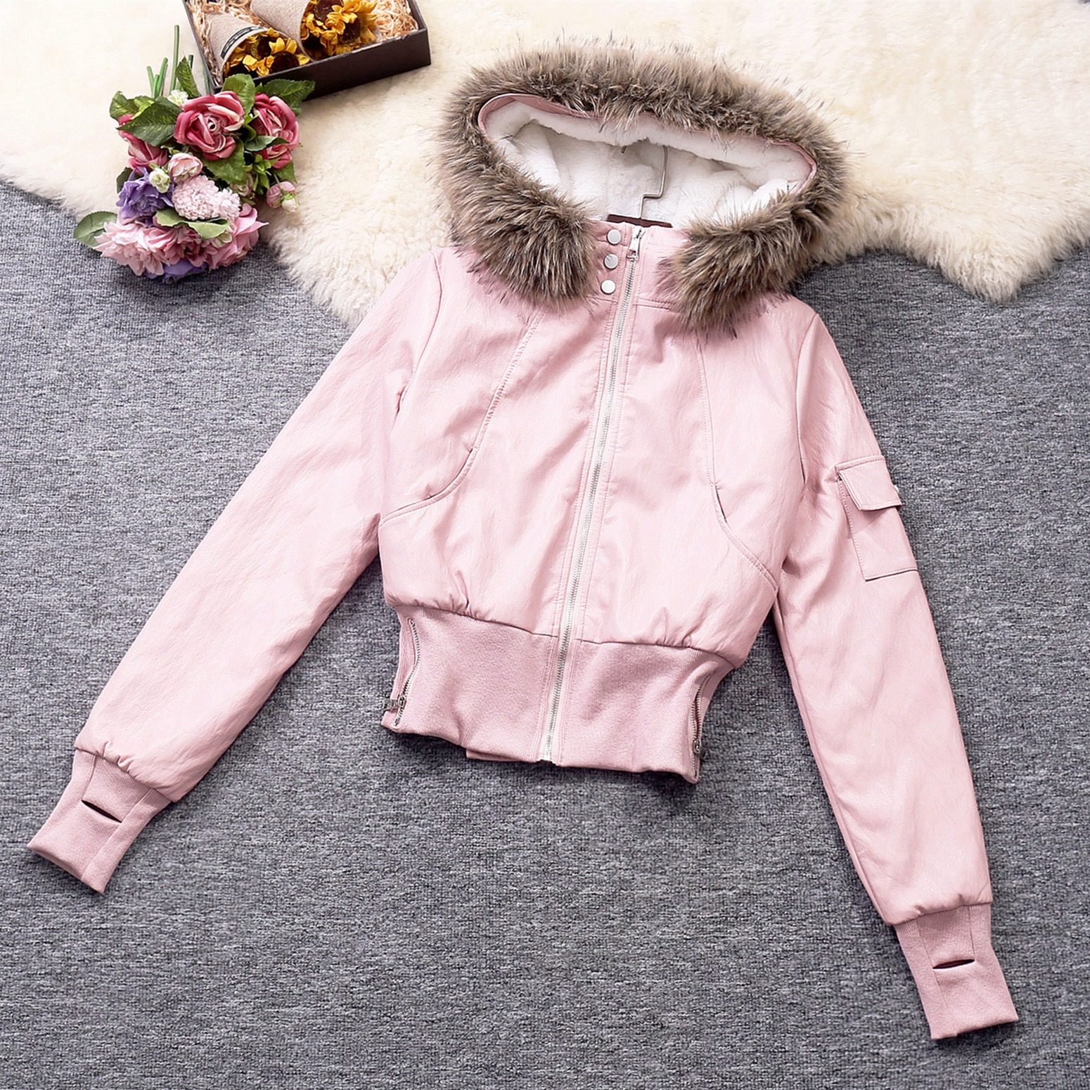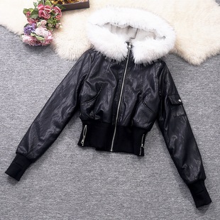 PU皮质短外套 大毛毛领连帽拉链立领加厚绒毛里衬修身 实拍冬季 女装