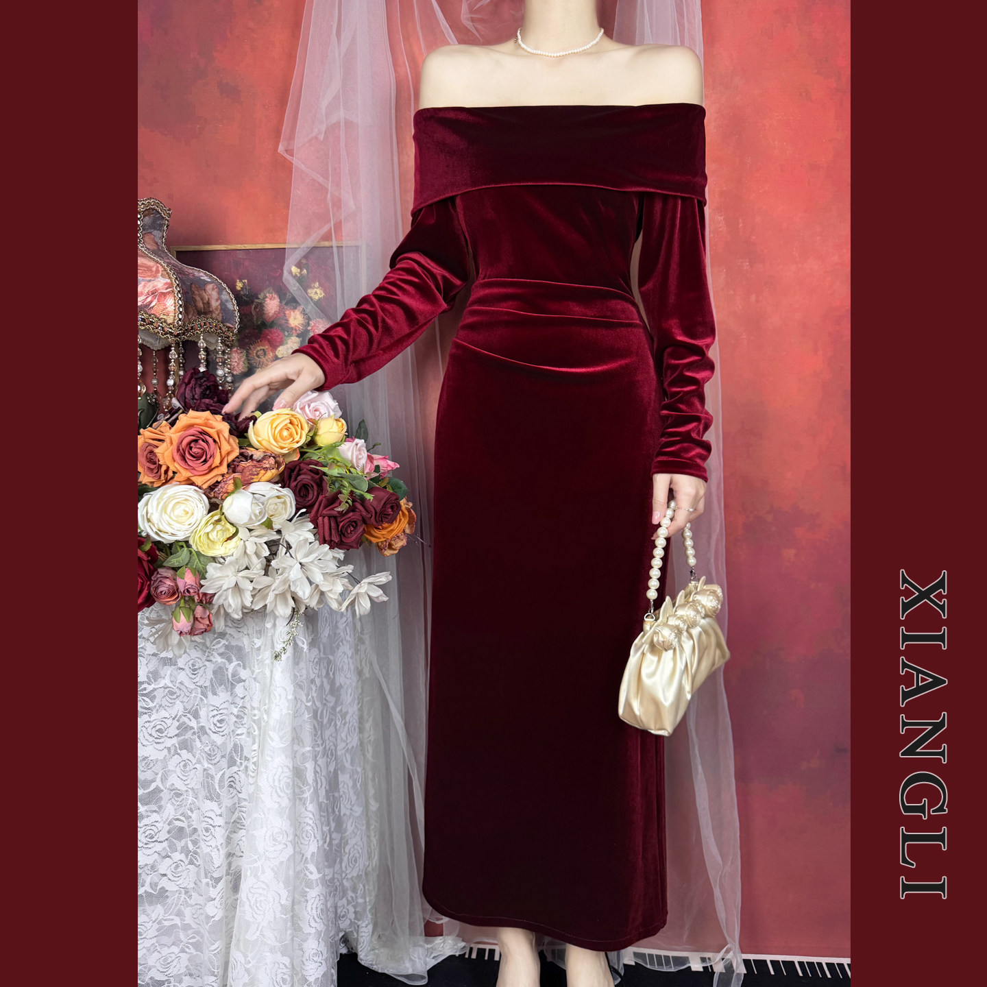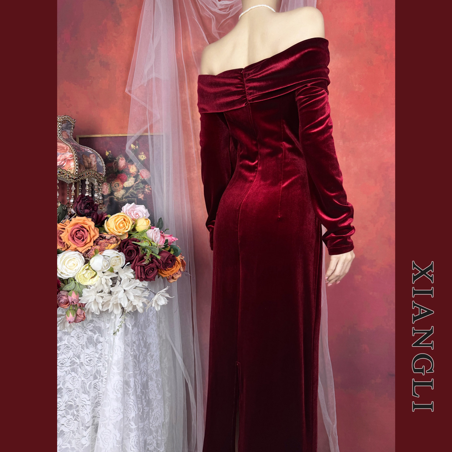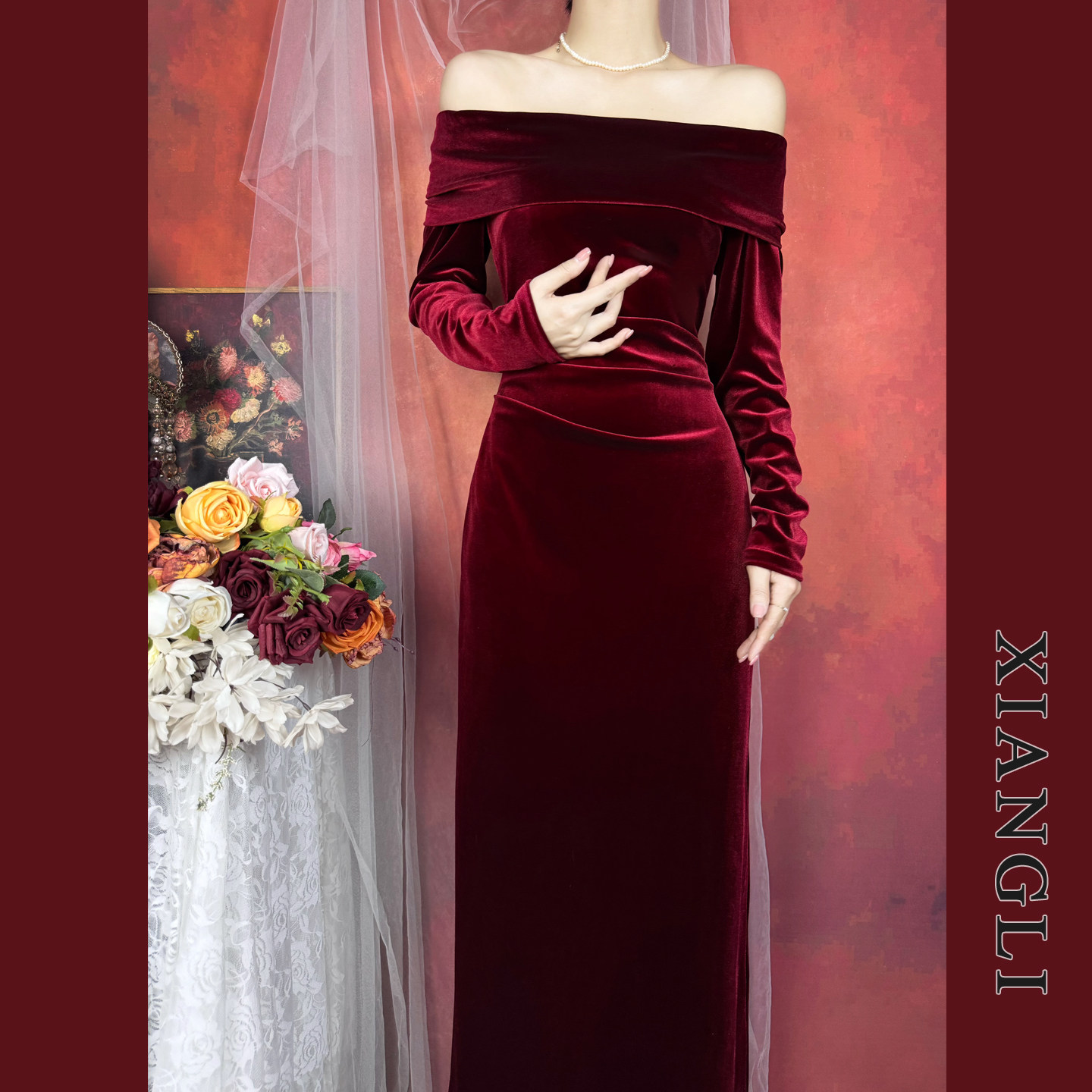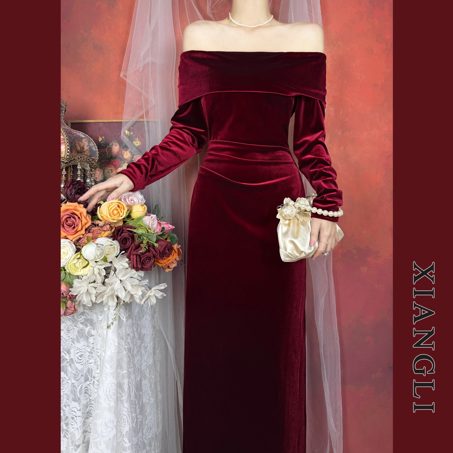 巷里法式 显瘦开叉气质高级敬酒订婚礼服 一字肩红色丝绒连衣裙冬装